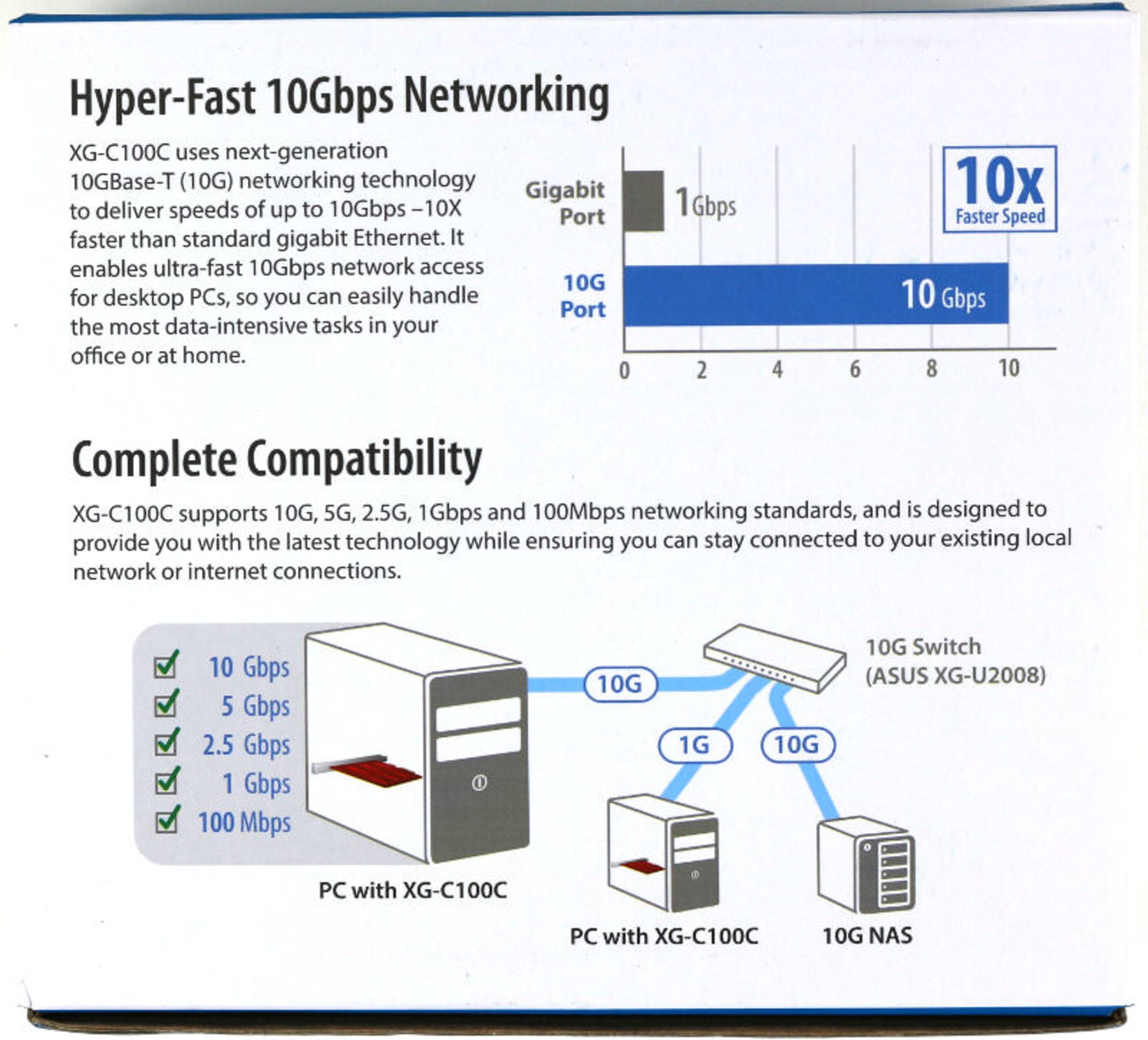 ازآنجایی که کارت جدید ایسوس بهصورت همزمان از چندین استاندارد پشتیبانی میکند، برای کسانی که قصد سیمکشی مجدد ندارند و میخواهند بدون استفاده از کابلهای کتگوری ۶ سرعت شبکهی خود را ارتقاء بدهند، انتخاب بسیار مناسبی خواهد بود.