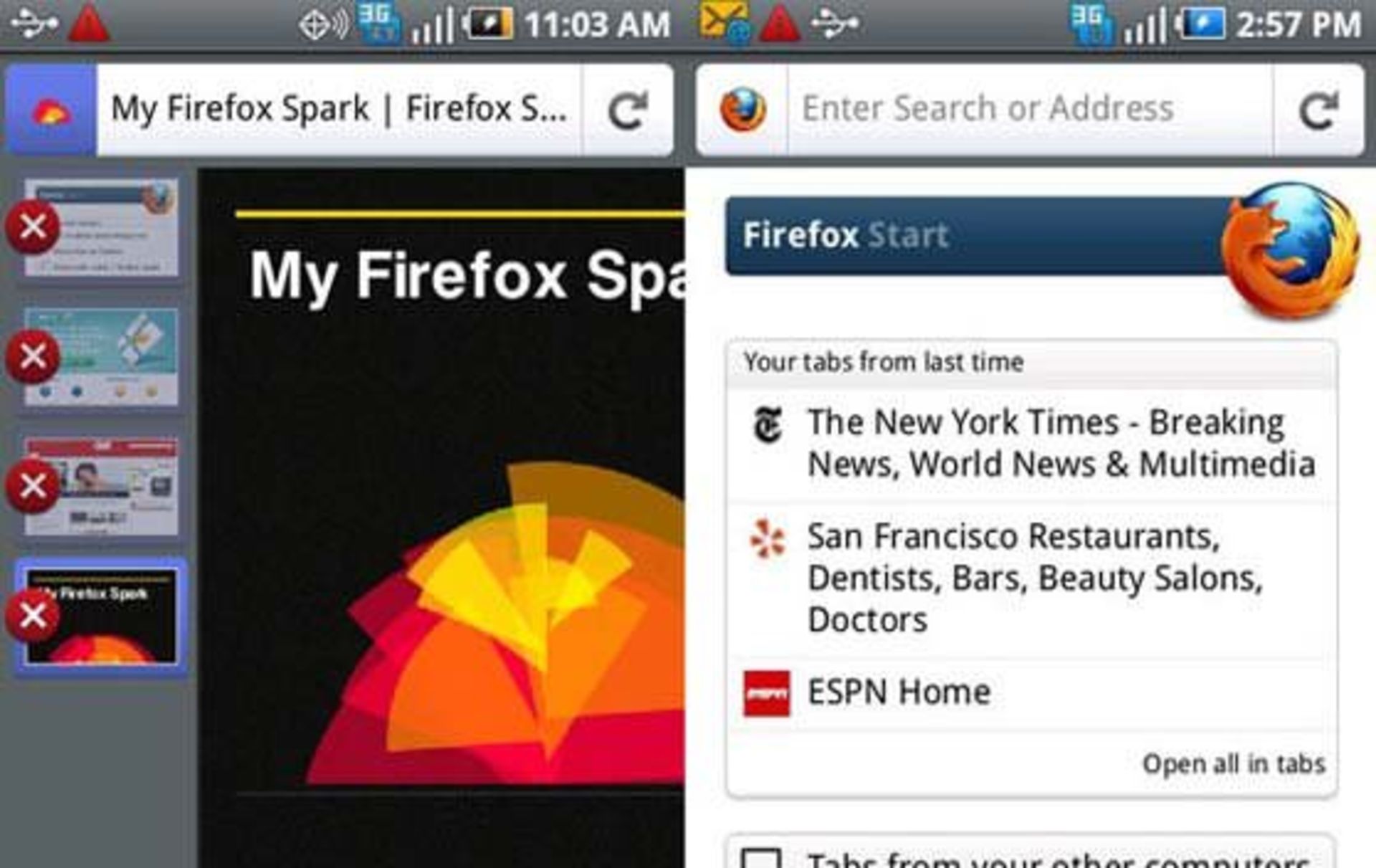 بالاخره موزیلا، نسخه موبایل Firefox 4 را عرضه کرد این مرورگر مخصوص تلفن و تبلت های مجهز به سیستم عامل اندروید و Maemo است. این نسخه از Firefox 4 دارای امکاناتی مانند باز کردن صفحات در تب های مختلف، بوک مارک و فایرفاکس Sync است و همچنین قابلیت نصب برخی از Add-Ons ها را دارد. Firefox 4 Mobile دارای قابلیت های بسیار خوب و تازه ای است ولی متاسفانه از وسایل الکترونیکی مجهز به پردازنده ARM v6 و Adobe Flash پشتیبانی نمی کند.