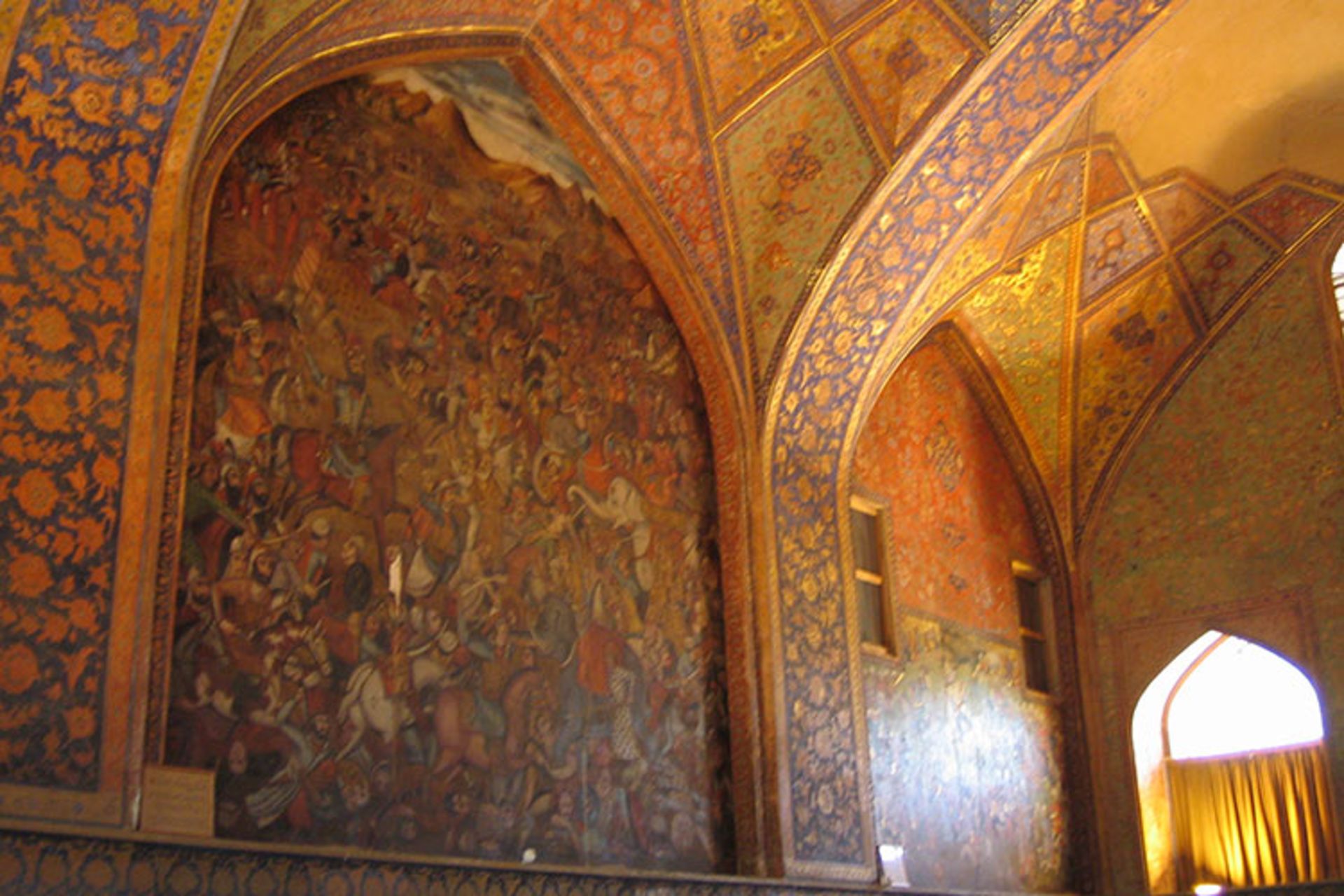 - سقف باشکوه نقاشی تالار ۲۰ ستون و سقف آینهکاری تالار آینه و مدخل آینهکاری تالار جلوس شاهعباس دوم