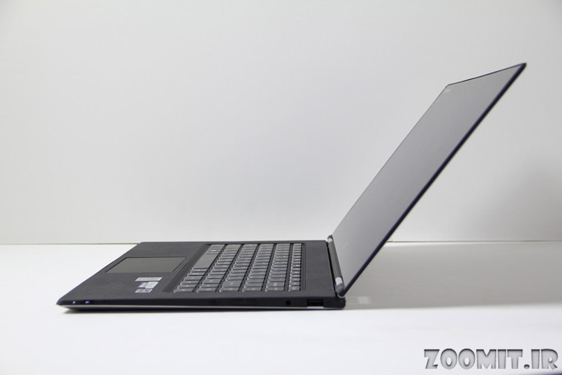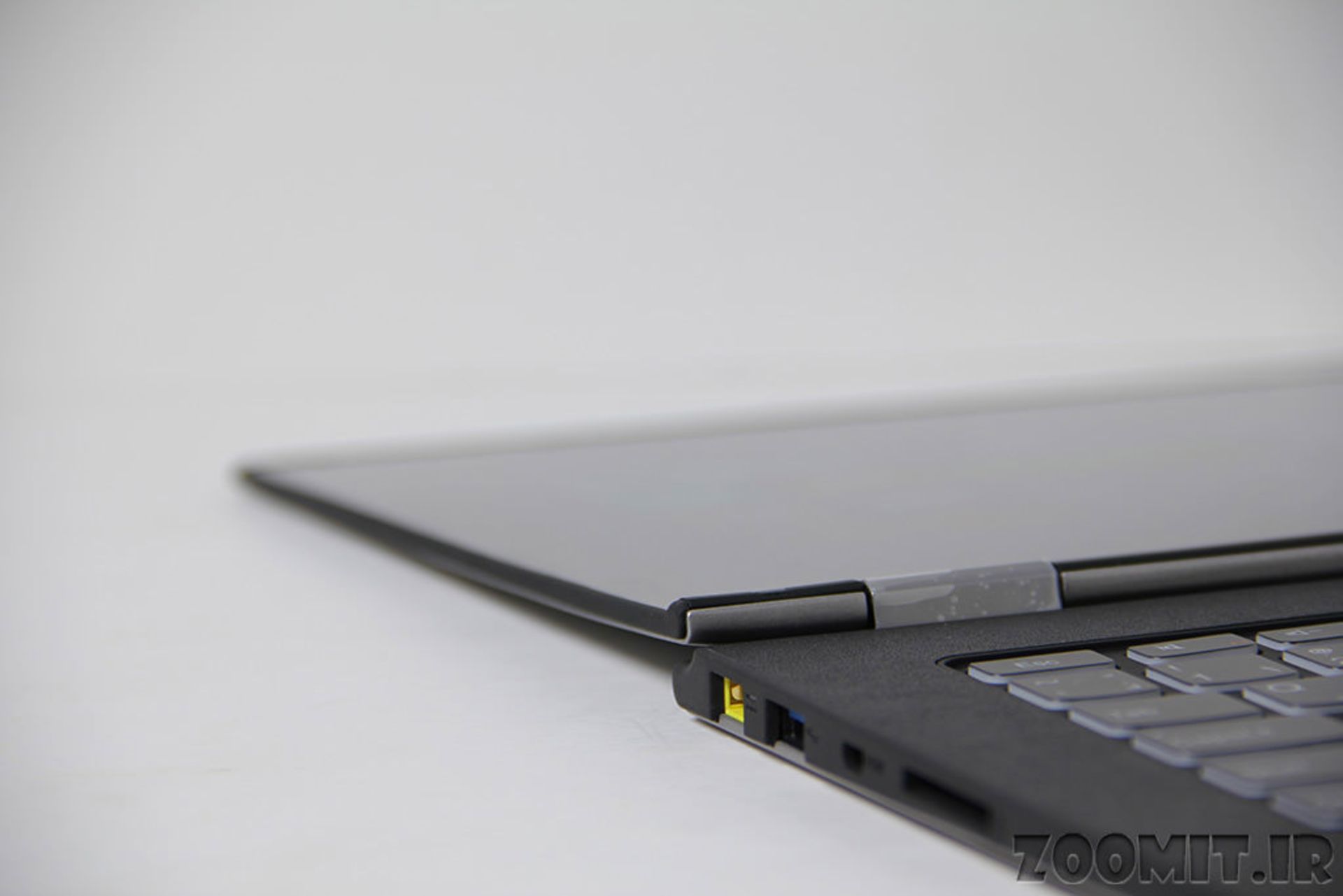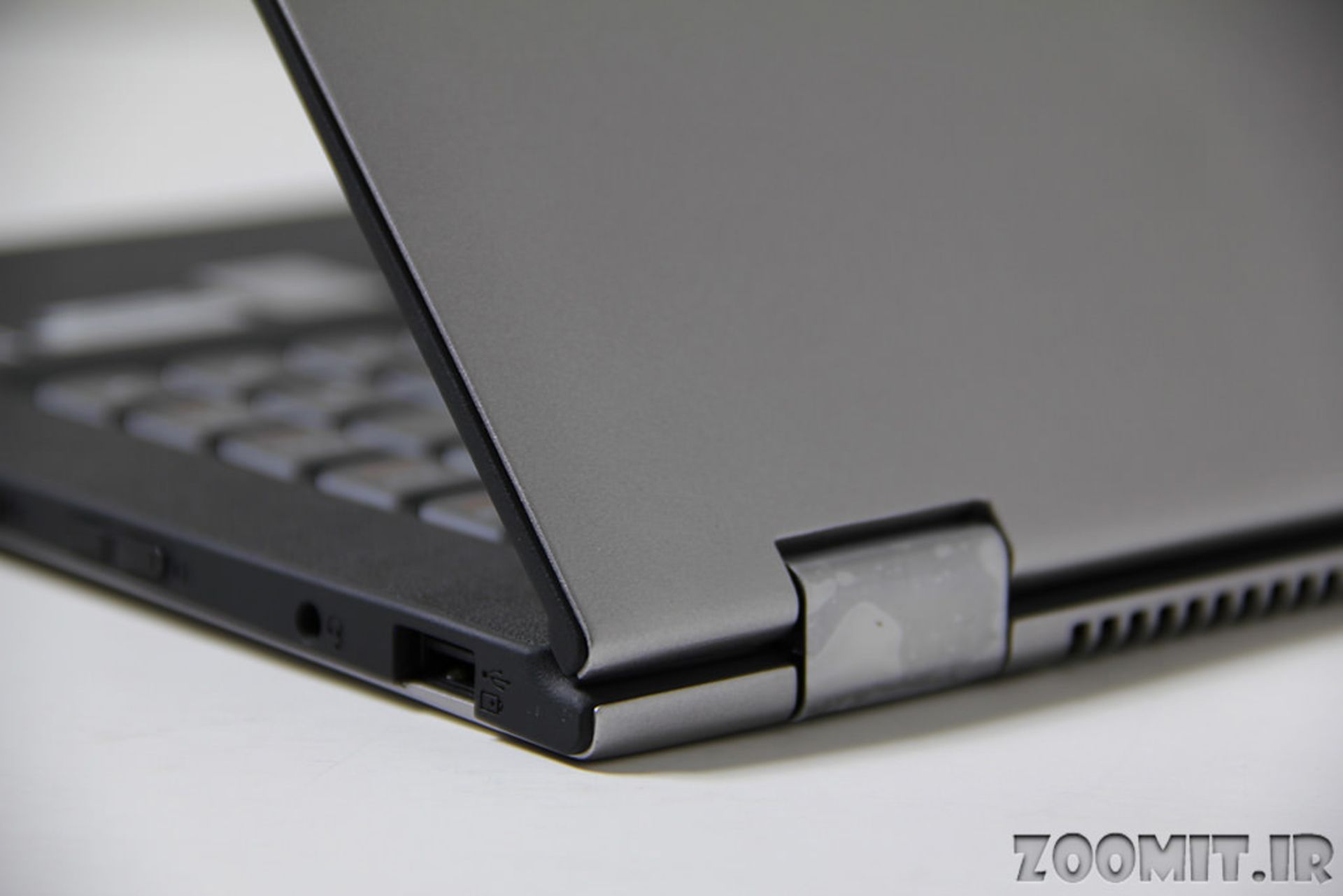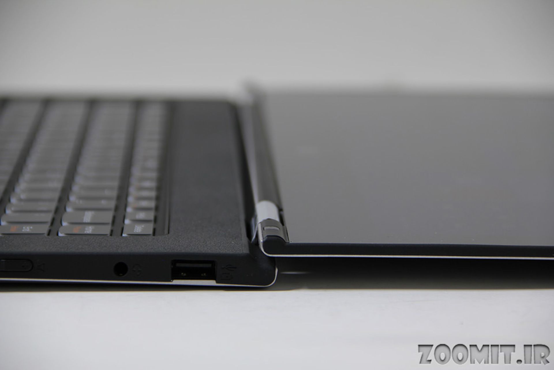 طراحی این اولترابوک به شکلی است که در بخش جلو کمی تیزتر و باریکتر میشود، بنابراین روی لبه جلویی دستگاه هیچ درگاه و منفذی وجود ندارد. در لبه پشت نیز شاهد منافذ خروجی حرارت هستیم که طراحی جالبی داشته و به دلیل آن که این منفذ در پشت دستگاه هستند میتوان به راحتی از آن بر روی هر سطحی استفاده کرد.