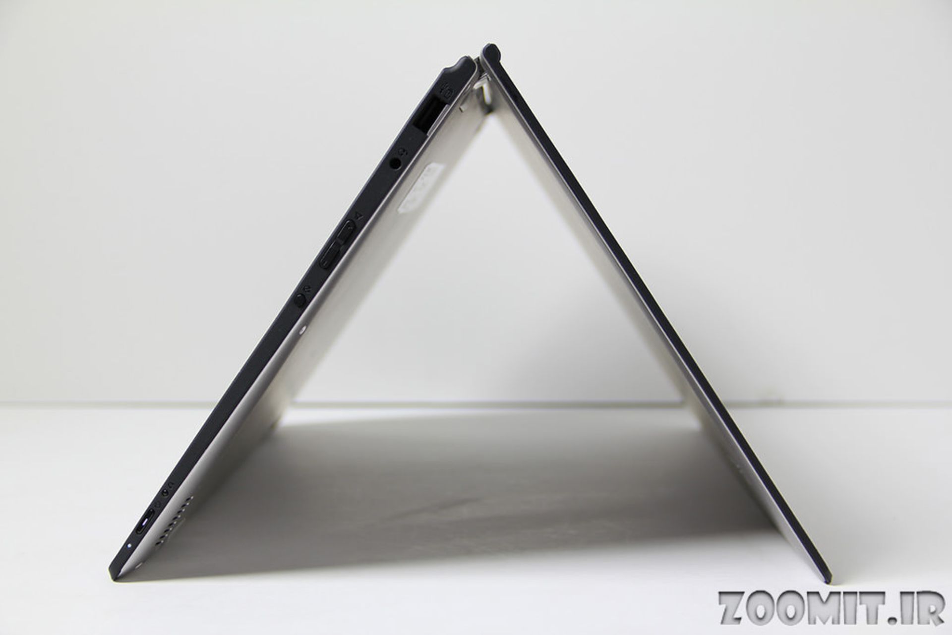 حالت استند که برای تماشای فیلم میتواند کارآمد باشد و در آخر حالت تبلت. در این حالت صفحه کلید به طور کامل در پشت نمایشگر قرار میگیرد. در این حالت صفحه کلید از کار میافتد تا وقتی آن را در دست میگیرید کلیدها به اشتباه فشرده نشوند. اما با این وجود حالت تبلت چندان رضایت بخش نیست و کار کردن با یک تبلت ضخیم ویندوزی ۱۳ اینچی آن هم در حالی که پشت آن یک صفحه کلید باشد کمی عجیب و نامطلوب به نظر میرسد. البته همانطور که اشاره شد خوشبختانه وقتی این تبلت را در حالتهای استند و تبلت قرار میدهید کیبورد غیرفعال میشود تا برخورد دست و سطح با دکمهها مشکلساز نشود.