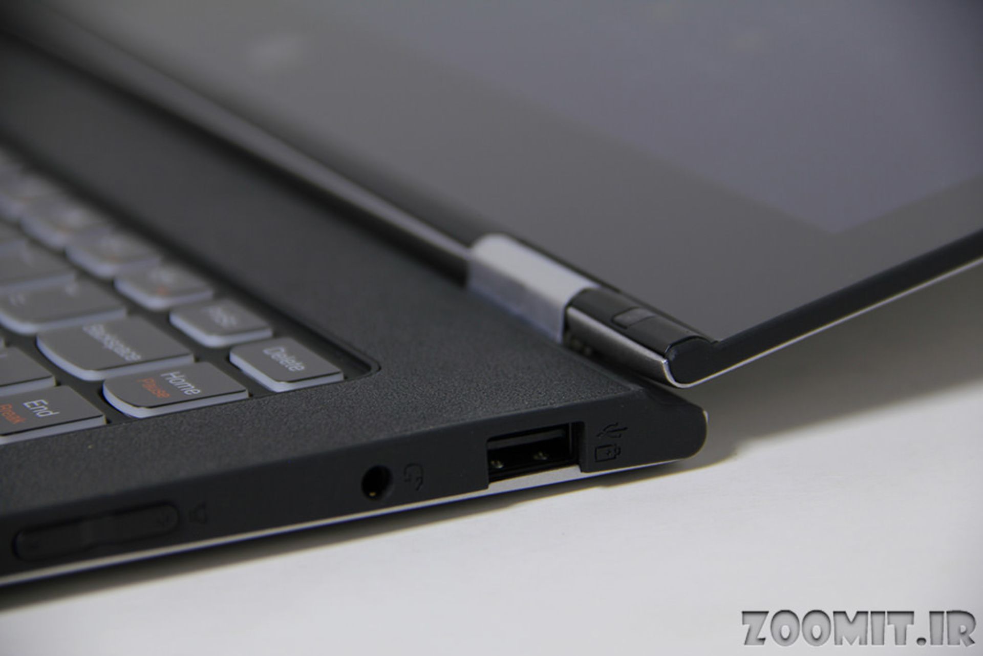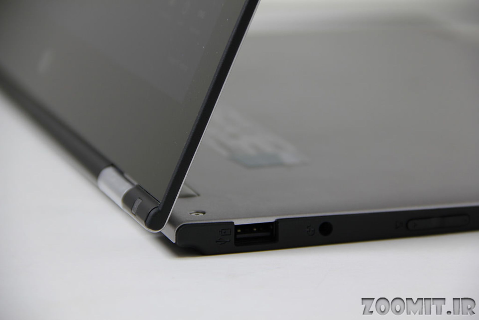 همه دکمههای کنترلی و پورتهای این دستگاه در اطراف آن تعبیه شدهاند. روی لبه سمت راست، دکمه روشن و خاموش کردن و دکمه معروف OneKey Recovery لنوو، دکمه فعال و غیرفعالسازی چرخش خودکار صفحه، دکمههای تغییر حجم صدا، جک ۳.۵ میلیمتری هدفون و یک پورت USB 2.0 دیده میشود. ممکن است بگویید چقدر لبه سمت راست دستگاه شلوغ است! ولی اگر به تصاویر توجه کنید، میبینید این دکمهها و پورتها چندان دیده نمیشوند و به زیبایی ظاهری دستگاه صدمهای وارد نکردهاند. روی لبه سمت چپ هم یک درگاه کارت SD، یک پورت microHDMI، یک پورت USB 3.0 و در نهایت درگاه شارژ معروف لنوو را میبینیم که در اکثر لپتاپهای این کمپانی دیده میشود.