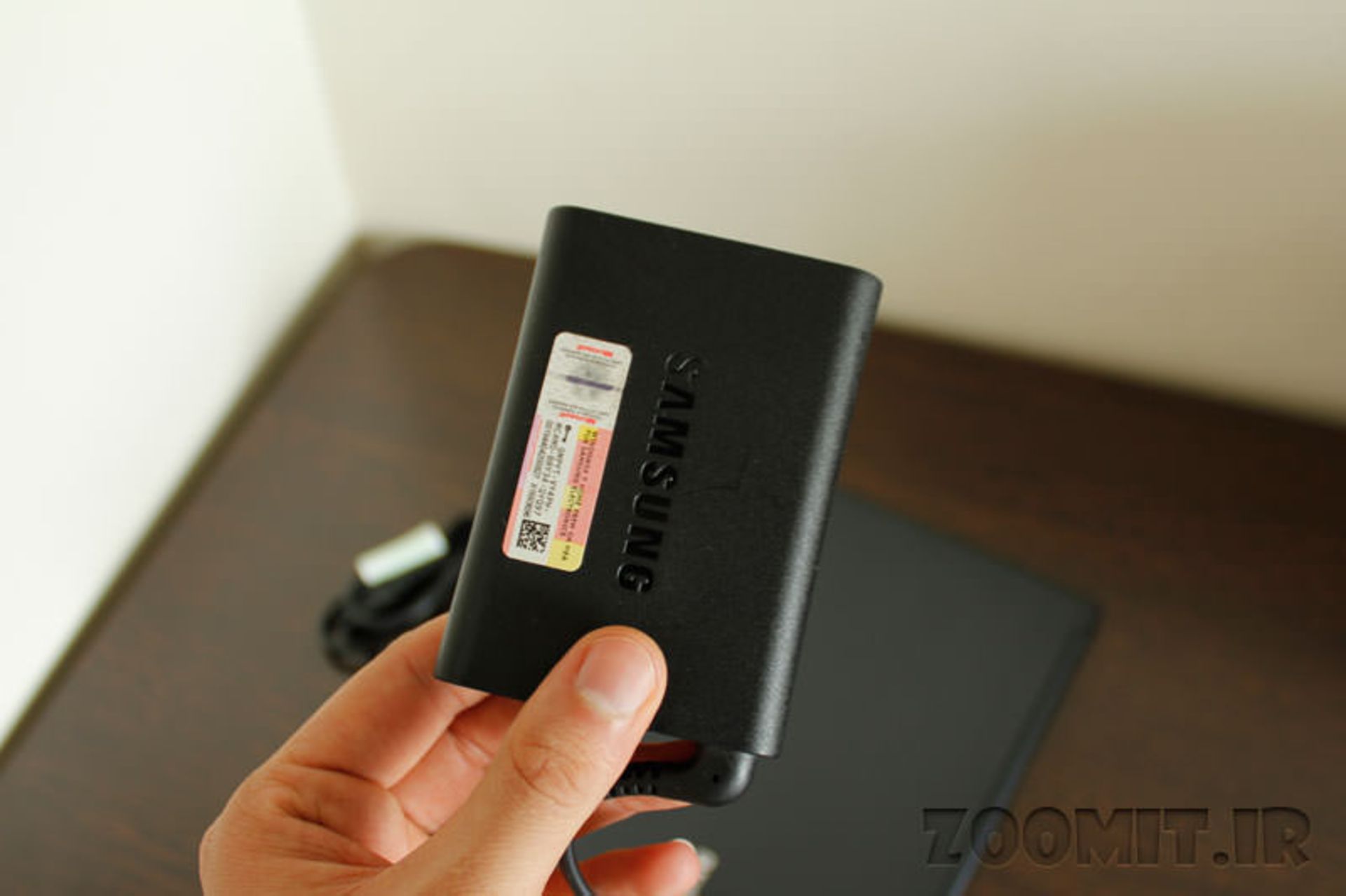 پیش از این که به بررسی طول عمر باتری بپردازیم لازم است به این نکته اشاره کنیم که آداپتور شارژر لپتاپهای سری ۹ سامسونگ ابعاد باریک و کوچک و وزن سبکی دارند. این آداپتور بسیار باریکتر و سبکتر از آداپتور لپتاپ معمولی و حتی اولترابوکهای سری ۵ سامسونگ است. بدینترتیب حتی اگر بخواهید آداپتور و کابل برق را نیز به همراه لپتاپ خود حمل کنید، بازهم فضای بسیار کمی اشغال شده و وزن لپتاپ نیز تنها حدود ۲۰۰ گرم افزایش مییابد.