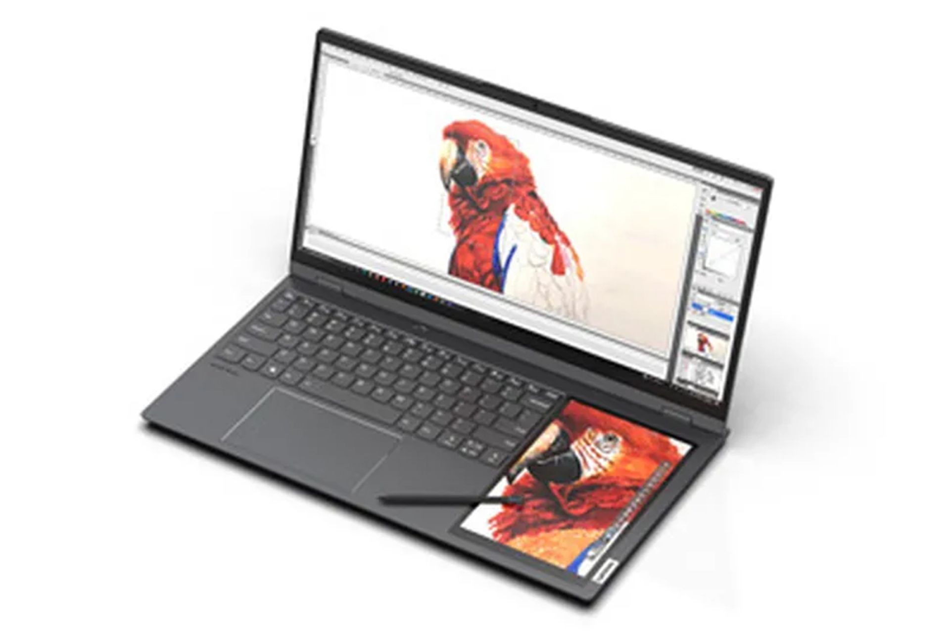 علاوه بر این در این تصویر وسیلهای شبیه به قلم طراحی مشاهده میشود که باعث میشود ایده طراحی به کمک صفحهنمایش دوم قوت بگیرد.