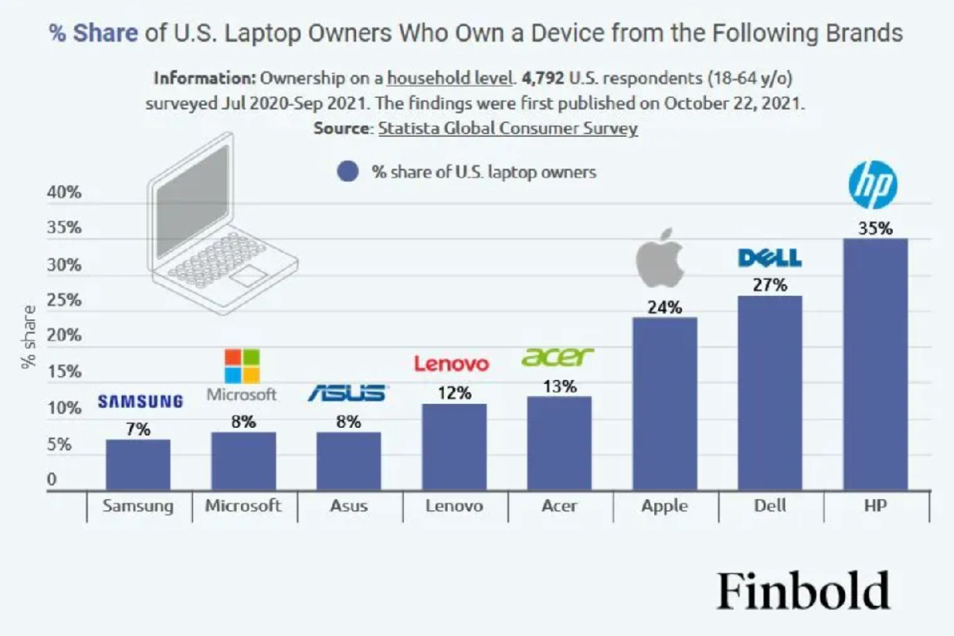 سرانجام، ایسر با ۱۳ درصد سهم در رتبه چهارم و پس از آن لنوو با ۱۲ درصد قرار دارد. مایکروسافت و ایسوس نیز بهطور مشترک ۸ درصد از سهم بازار را در اختیار داند و سامسونگ با ۷ درصد کمترین سهم بازار را دارد. جالب است بدانید که دادههای مربوط به سهم بازار لپتاپ ایالات متحده براساس نظرسنجی Statista در بین جولای ۲۰۲۰ تا سپتامبر ۲۰۲۱ صورت گرفته است و در آن، از ۴۷۹۲ پاسخدهنده آمریکایی بین ۱۸ تا ۶۴ سال نظرسنجی شد.