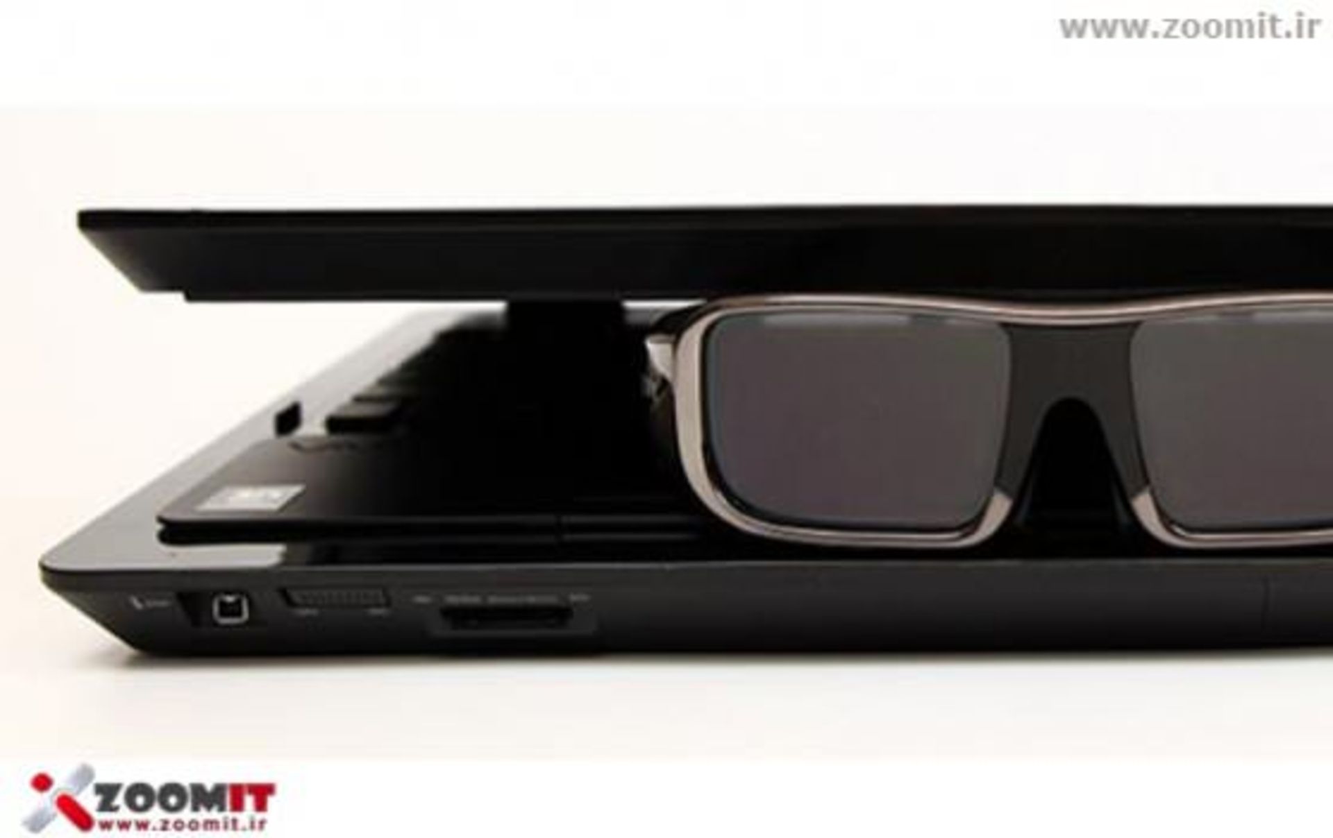 عینک این لپ تاپ سه بعدی که با تکنولوژی Active Shutter کار می کند، سبک نیست و ممکن است هنگام مشاهده فیلم، سنگینی زیاد آن را روی بینی خود احساس کنید. پخش تصاویر سه بعدی در این نوت بوک به لطف کارت گرافیک NVIDIA و فناوری این شرکت میسر شده است برای آشنایی با نحوه نمایش سه بعدی در کامپیوتر و مشاهده بررسی NVidia 3D Kit به مقاله "بررسی Nvidia 3D Vision Kit - اجرای بازی های سه بعدی در PC" مراجعه نمایید.