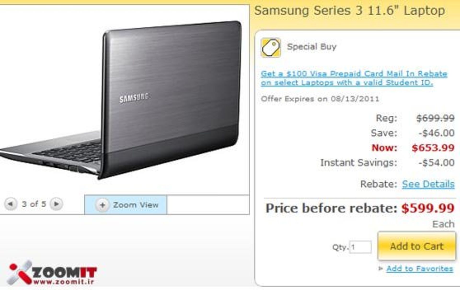 نوت بوک 11.6 اینچی سری 3 سامسونگ 599 دلار قیمت گذاری شده است. پردازنده این نوت بوک Intel Core i3-2357M از خانواده Sandy Bridge است.