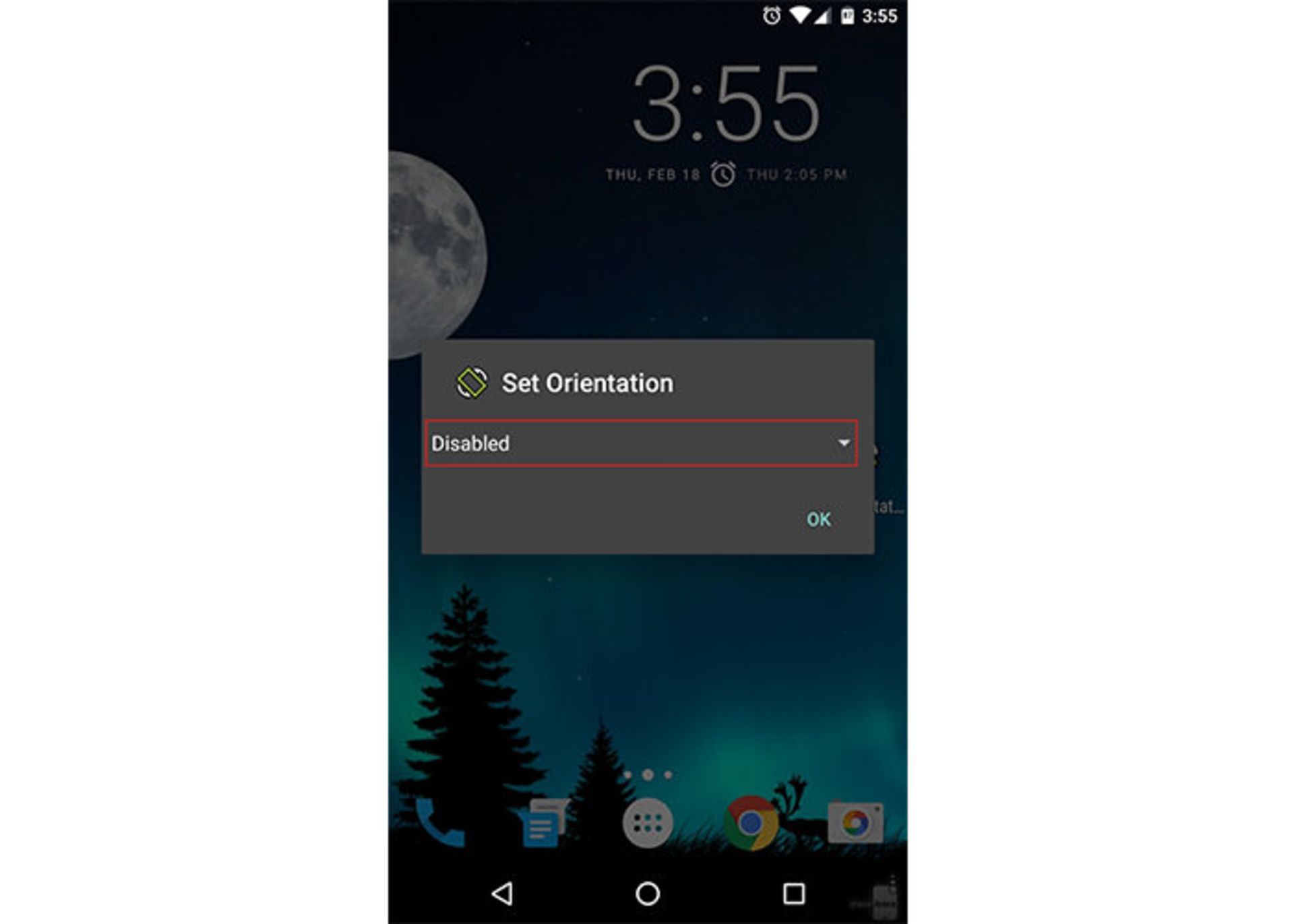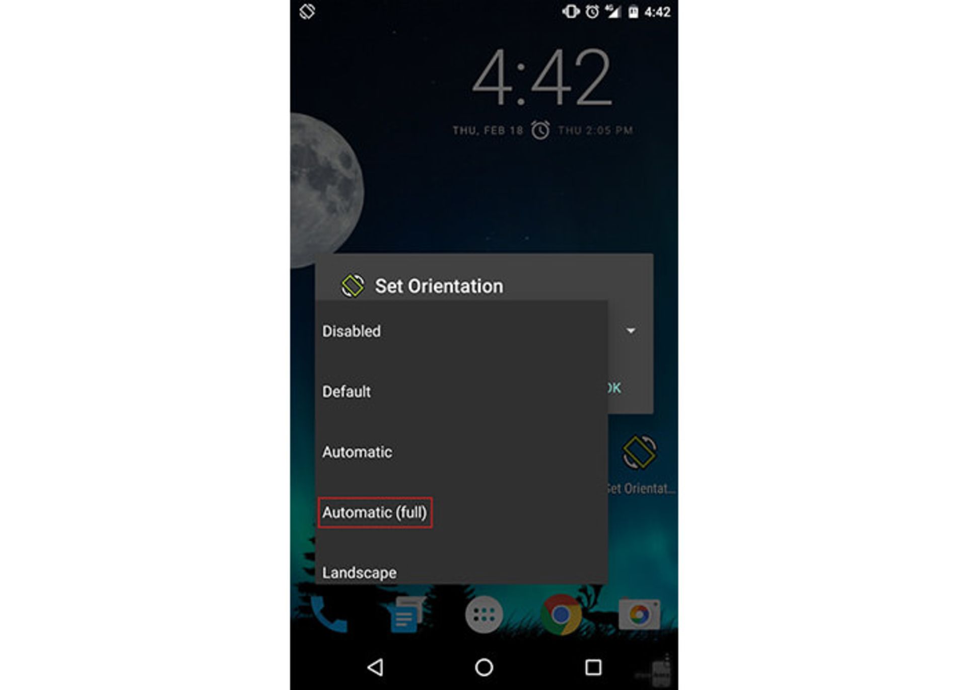 نرمافزار Set Orientation را میتوانید از لینک موجود در انتهای مقاله دریافت و نصب کنید. پس از نصب و اجرای آن، نرمافزار یک منوی کشویی را نشان میدهد که امکان انتخاب بین حالتهای مختلف چرخش نمایشگر را به کاربر میدهد. در صورتی که خواستار چرخش نمایشگر متناسب با جهتی که دستگاه هوشمند خود را در دست نگه میدارید هستید، باید گزینهی (Automatic (full را از لیست موجود انتخاب کرده و OK را لمس کنید. با انتخاب گزینهی یاد شده، اینستاگرام یا هر نرمافزاری که فقط در یک حالت افقی یا عمودی عمل میکند، متناسب با وضعیت قرارگیری دستگاه مجبور به چرخیدن خواهد شد.