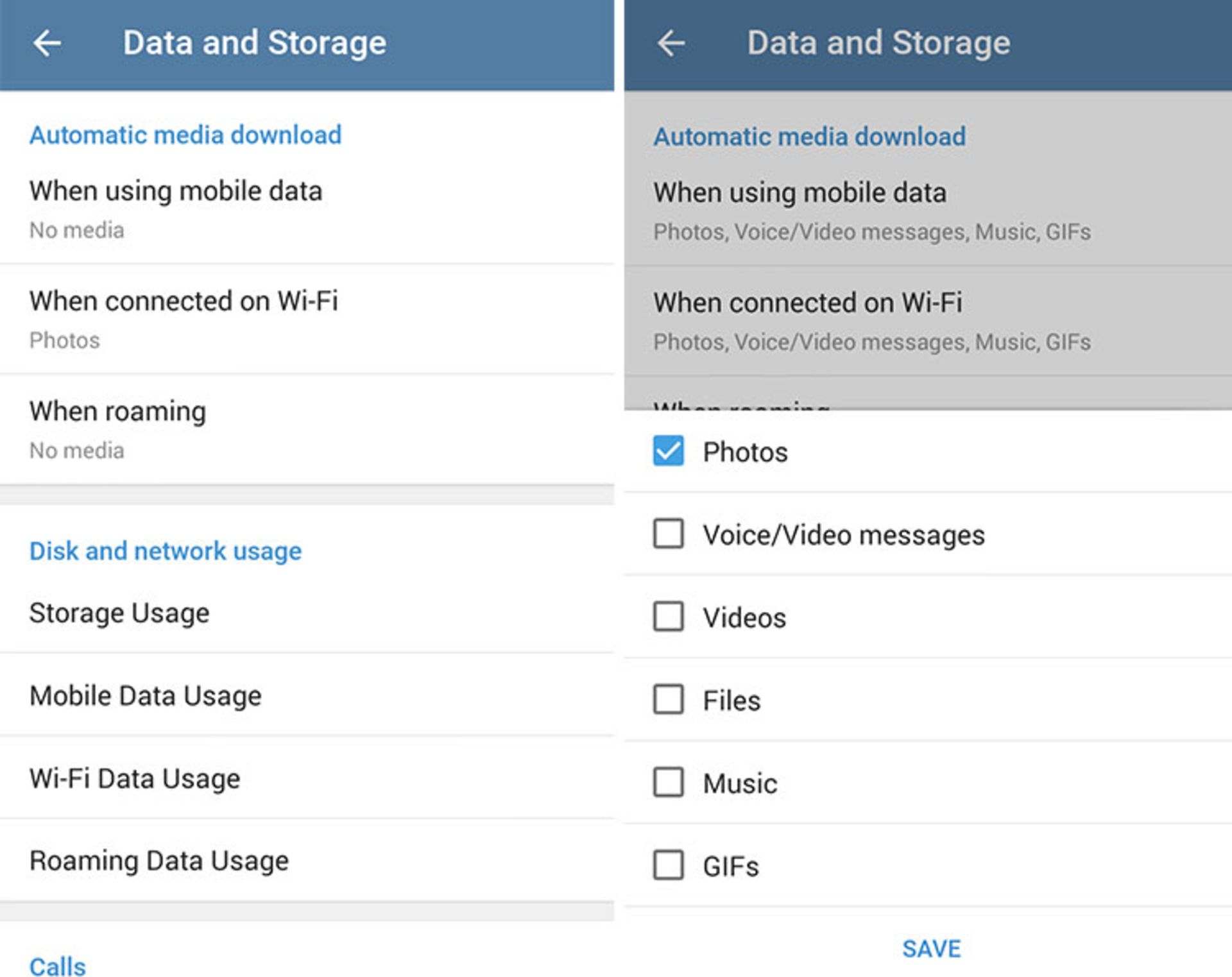 برای حل این موضوع، کافی است به Setting تلگرام مراجعه کنید و وارد بخش Data And Storage شوید. بعد از ورود به این صفحه، در همان بخش بالایی، دو گزینه تحت عنوان When Using Mobile Data (تنظیمات دانلود خودکار در اینترنت سیمکارت) و When Connected On Wi-Fi (تنظیمات دانلود خودکار در اینترنت وایفای) را مشاهده خواهید کرد. با لمس هر گزینه، لیستی شامل فرمتهای فایلی (عکس، ویس مسیج، ویدیو، فایل، موزیک، گیف) مشاهده خواهید کرد که با برداشتن تیک مربوط به هرکدام و لمس گزینهی Save میتوانید دانلود خودکار آن فایل را غیرفعال کنید. پیشنهاد ما این است که بهجز عکسها و ویسها، دانلود خودکار تمام موارد دیگر را غیرفعال کنید تا دیگر شاهد هدر رفتن حتی یک مگابایت برای فایلهایی که نیازی به آنها ندارید، نباشید و تنها ویدیوها، گیفها، موزیکها و فایلهایی را که مایل به استفاده از آنها هستید، دانلود کنید.
