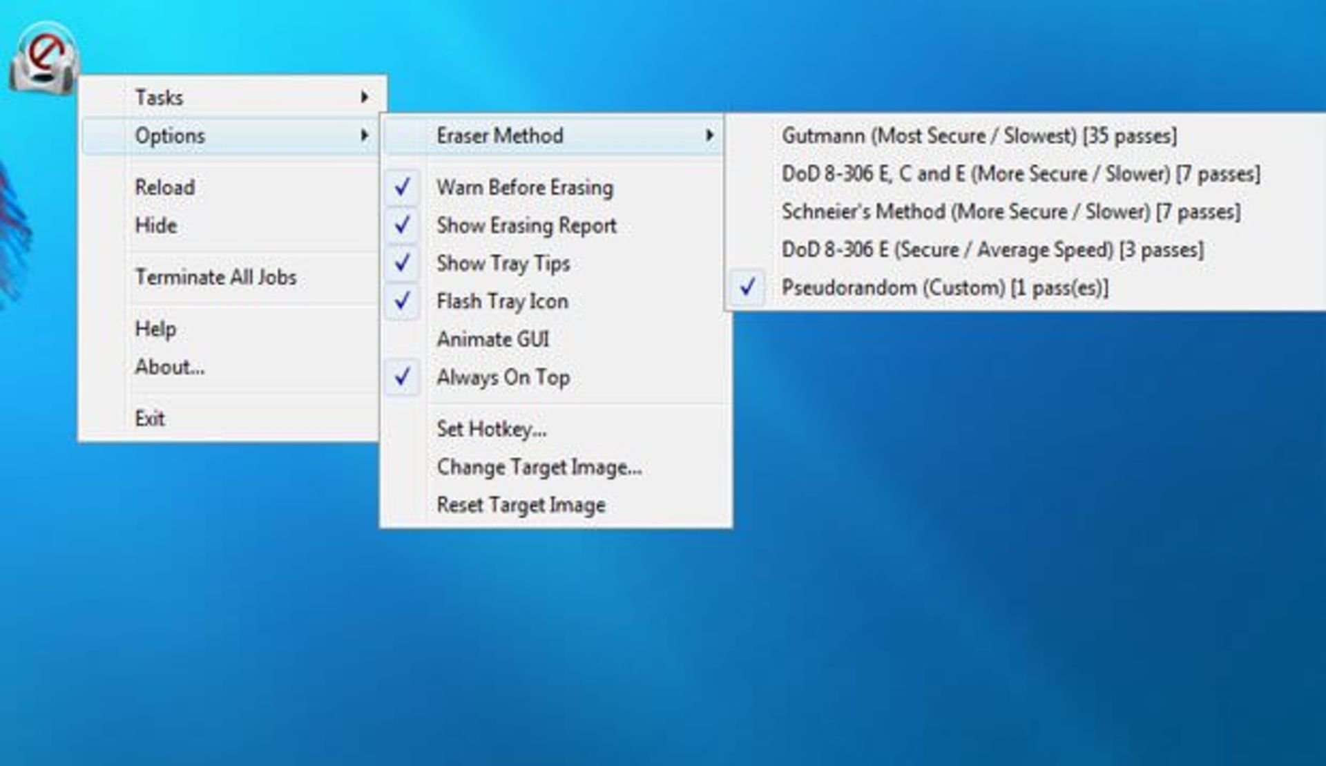 3. روی آیکون EraserDrop راست کلیک کرده، گزینه Options و سپس Eraser Method را انتخاب نموده و یکی از گزینه های لیست موجود را انتخاب کنید. هر کدام درجه ایمنی و سرعت متفاوتی دارند. روشهای کندتر ایمنتر هستند، اما زمان خیلی بیشتری را برای حذف فایلها نیاز دارند، به خصوص وقتی فایل مورد نظر حجیم باشد.