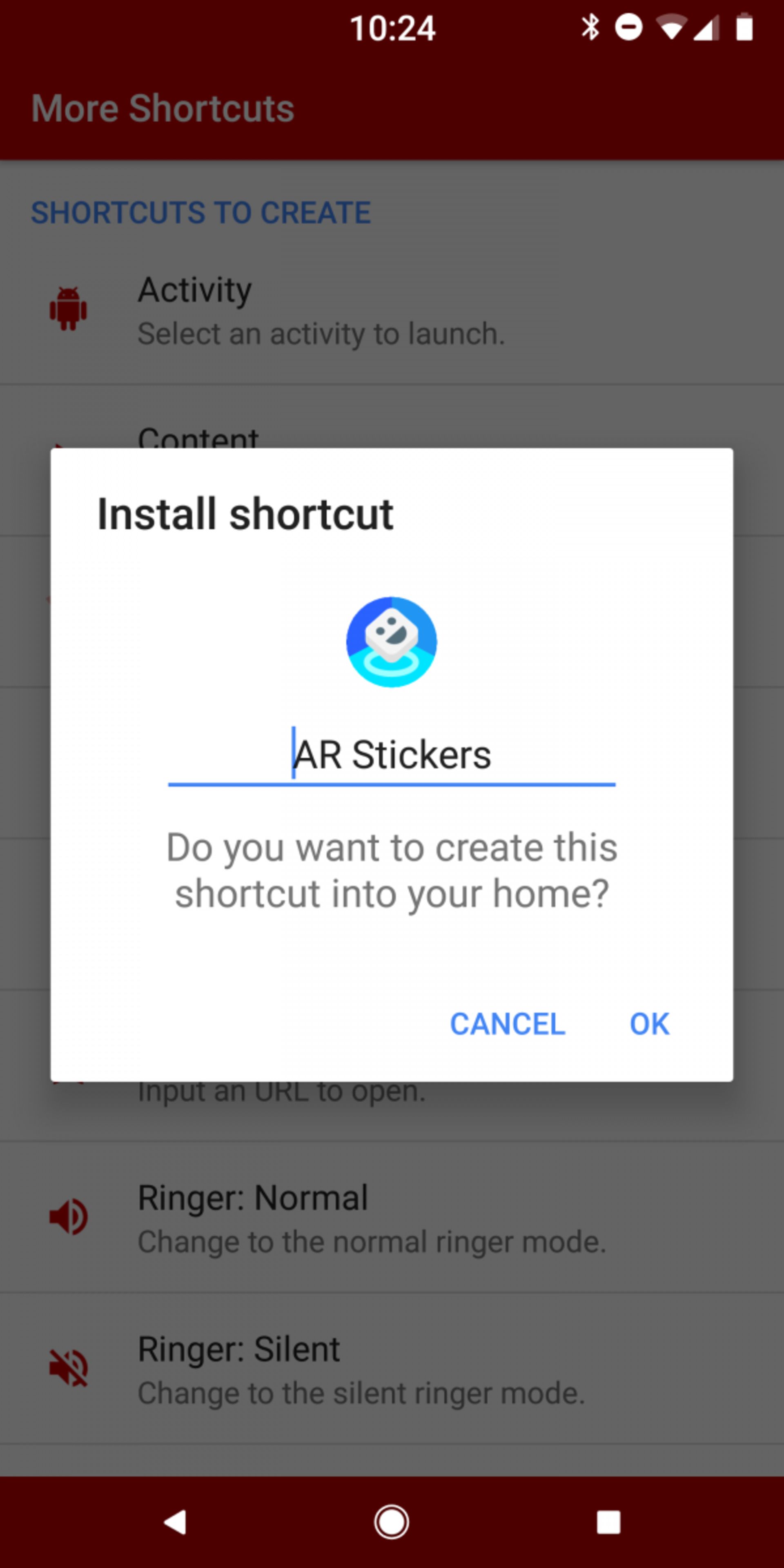 ۹. از بین موارد موجود ARStickers را انتخاب کنید؛ روی MainActivity بزنید و شورتکات آن را به هوم‌اسکرین گوشی اضافه کنید.