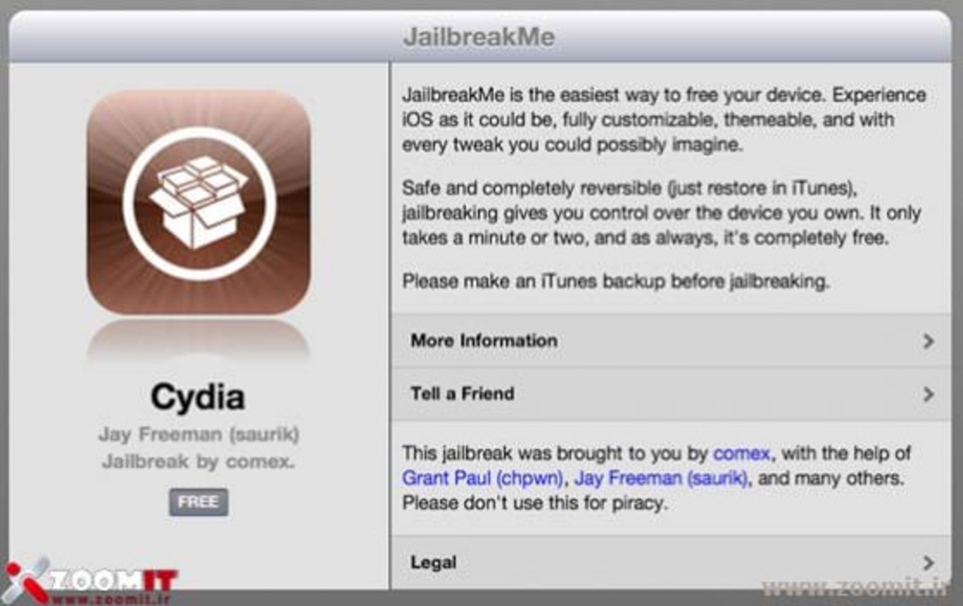 Jailbreakme یک سرویس جدید مبتنی بر مرورگر است که به وسیله آن می‌توانید دستگاه Apple خود را به‌سادگی Jailbreak کنید. تنها کافی است با استفاده از Wi-Fi به اینترنت متصل شده و مرورگر Safari را باز کرده و سپس به سایت jailbreakme مراجعه کنید و روی عبارت Free که در اولین عکس این مقاله هم نشان داده شده، کلیک کنید.
