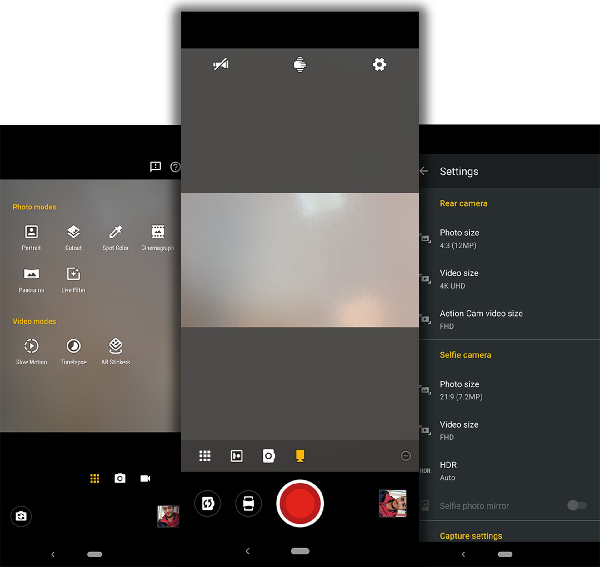 اپلیکیشن دوربین وان اکشن جزو معدود بخشهای سفارشیشده از رابط کاربری آن بهحساب میآید. با سوایپ بهسمت دو طرف میتوان بین عکاسی و فیلمبرداری و منو شامل سایر حالتها نظیر پرتره، تایملپس، پاناروما و اسلوموشن جابهجا شد؛ درحالیکه سوایپ به بالا یا پایین، امکان بزرگنمایی دیجیتال را به کاربر میدهد. در لبهی بالا نیز میانبرهایی برای منو تنظیمات، HDR، فلش، تایمر، عکاسی خودکار و دستی و عکسهای زنده بهچشم میخورد.