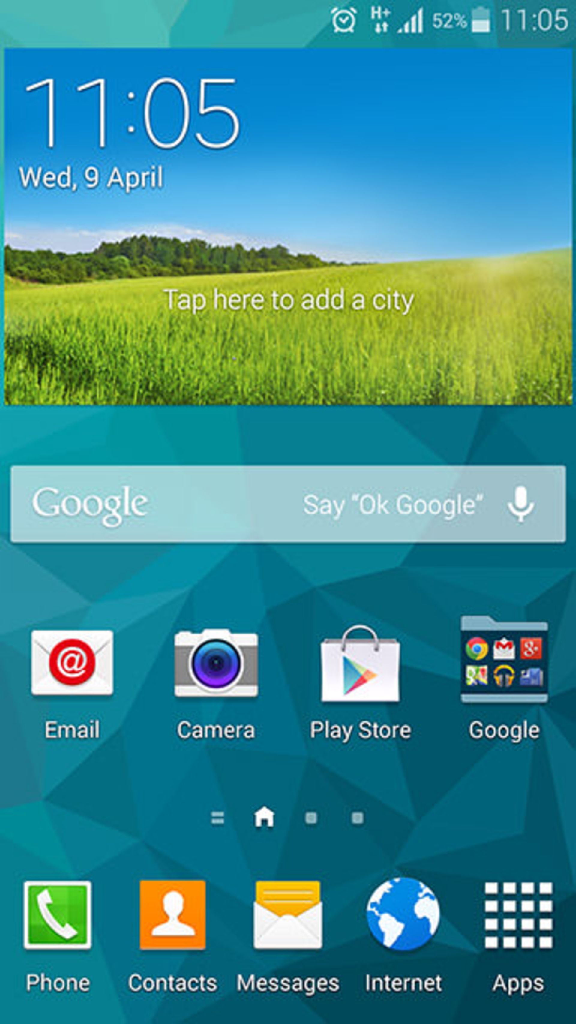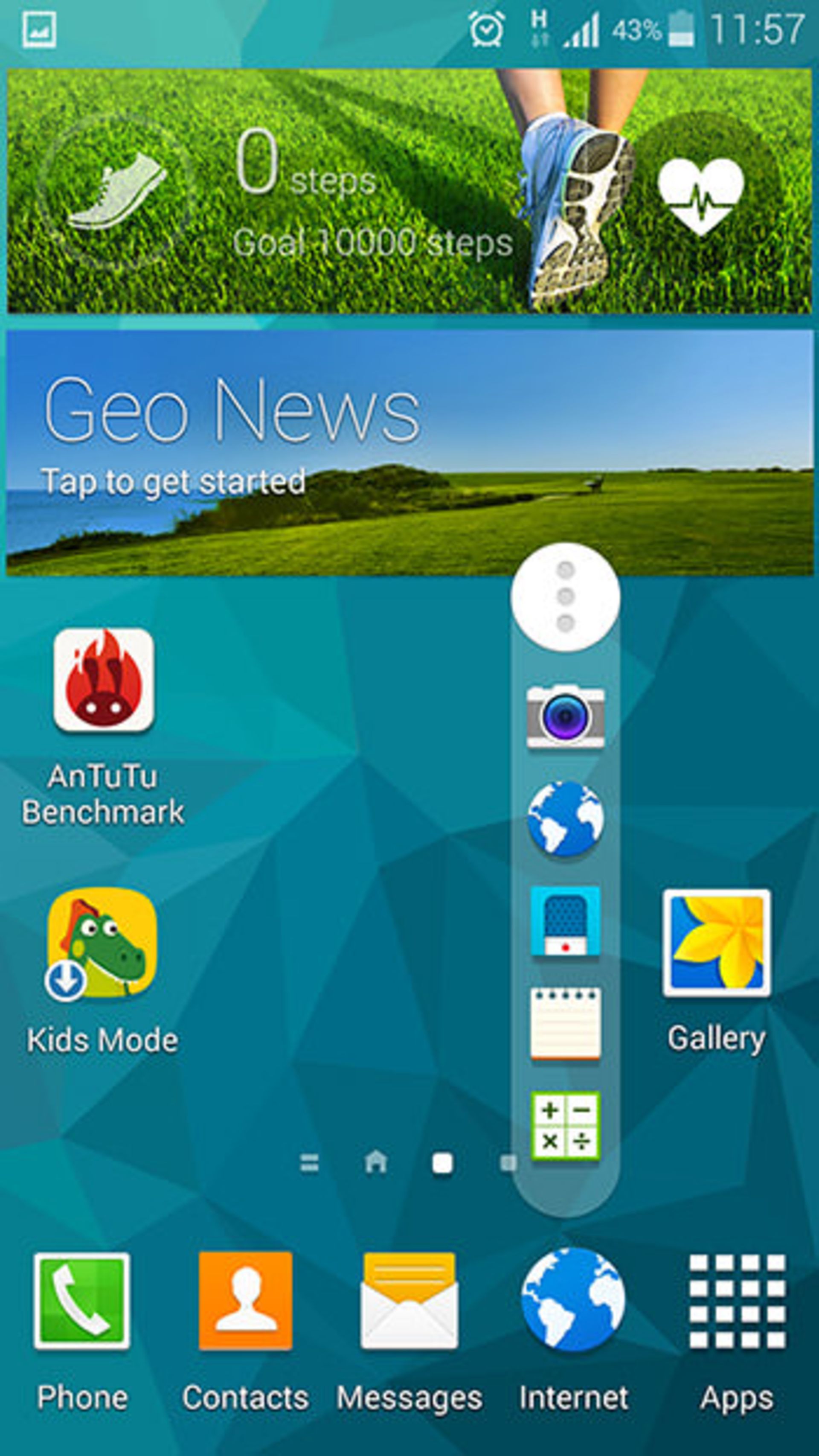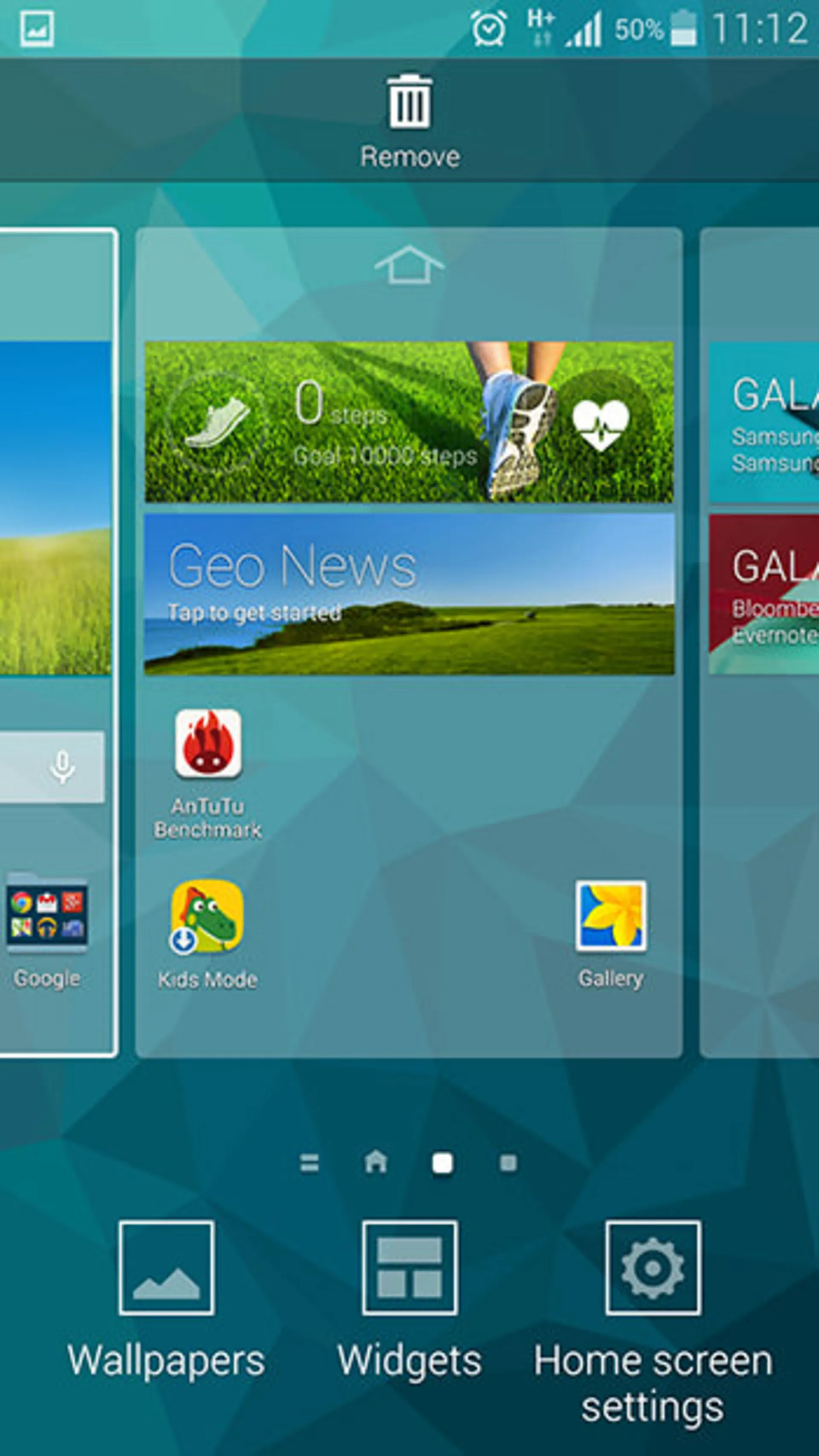 گلکسی اس 5 مجهز به نسخه 4.4.2 کیتکت از سیستمعامل اندروید است. همانطور که پیشتر در بررسی نکسوس 5 گوگل و الجی مشاهده کردیم، در اندروید جدید ویجتها به روشی کاملا متفاوت با قبل دردسترس کاربر قرار میگیرند. در پرچمدار جدید سامسونگ با لمس و نگهداشتن یک بخش خالی از صفحه خانه با حالتی به شکل بالا مواجه میشوید که ازطریق آن میتوانید صفحههای مختلف را جابهجا کرده، تصویر پسزمینه را انتخاب کرده، وارد تنظیمات صفحه خانه شده یا ویجتهای مورد نظرتان را اضافه کنید.