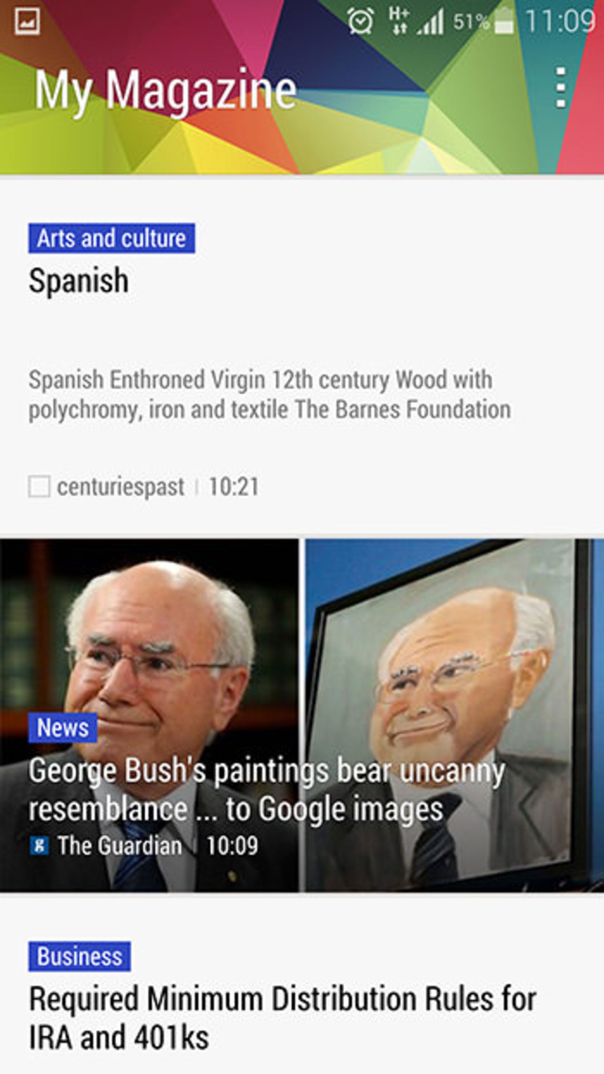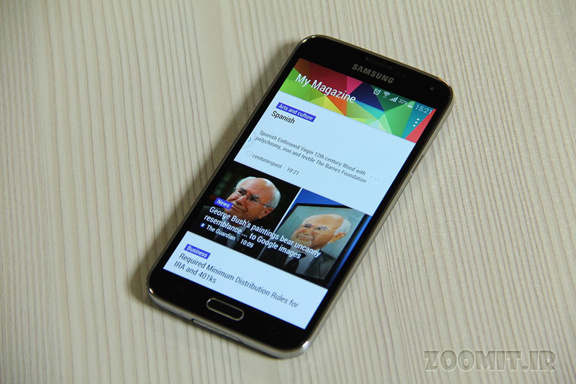 در نسخه کیتکت اندروید که با نکسوس 5 ارائه شد با کشیدن صفحه خانه از چپ به راست میتوانید به نمایی تمامصفحه از Google Now دسترسی پیدا کنید. سامسونگ قابلیت جدیدی بهنام Magazine UI را معرفی کرده که دقیقاً از همین طریق قابل دسترس است و فقط بهجای Google Now با یک رابط مجلهای که با همکاری فلیپبورد طراحی شده دسترسی خواهید داشت. قابلیتهای Magazine UI از خود اپلیکیشن فلیپبورد کمتر بوده و درواقع میتوان آن را نسخه خلاصهای از اپلیکیشن قدرتمند Flipboard لقب داد.