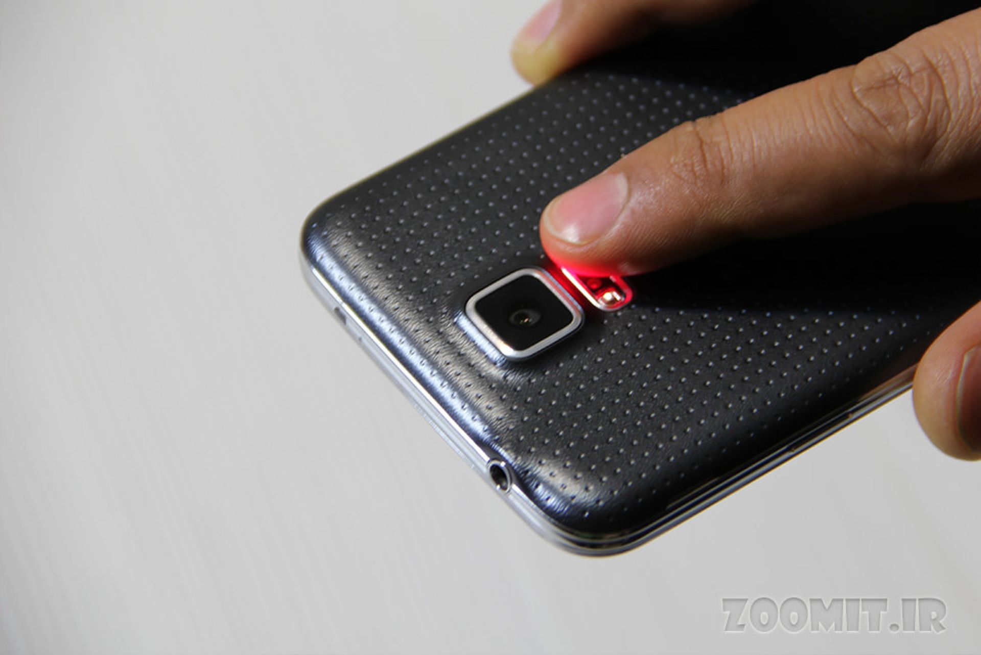 حسگر اثر انگشت با دکمه فیزیکی خانه (Home) یکپارچه شده است؛ شبیه به آنچه در آیفون 5s نیز شاهد آن بودیم. برای فعالکردن حسگر اثر انگشت، سیستم از کاربر درخواست میکند تا چندین بار انگشت را روی حسگر بکشید. اگر انگشت خود را به آرامی روی حسگر بکشید، عمل تشخیص به خوبی انجام میشود. برخلاف آیفون 5s که برای تشخیص اثر انگشت، لازم است تا انگشت خود را روی دکمه اصلی قرار دهید، در گلکسی اس ۵ باید انگشت را از کمی بالاتر از دکمه فیزیکی به سمت پایین بکشید. تشخیص اثر انگشت کاربر در حسگر گلکسی اس ۵ با سرعت و دقت قابل قبولی انجام میشود؛ اما این حسگر فعلاً به جز بازکردن قفل گوشی کاربرد دیگری ندارد!