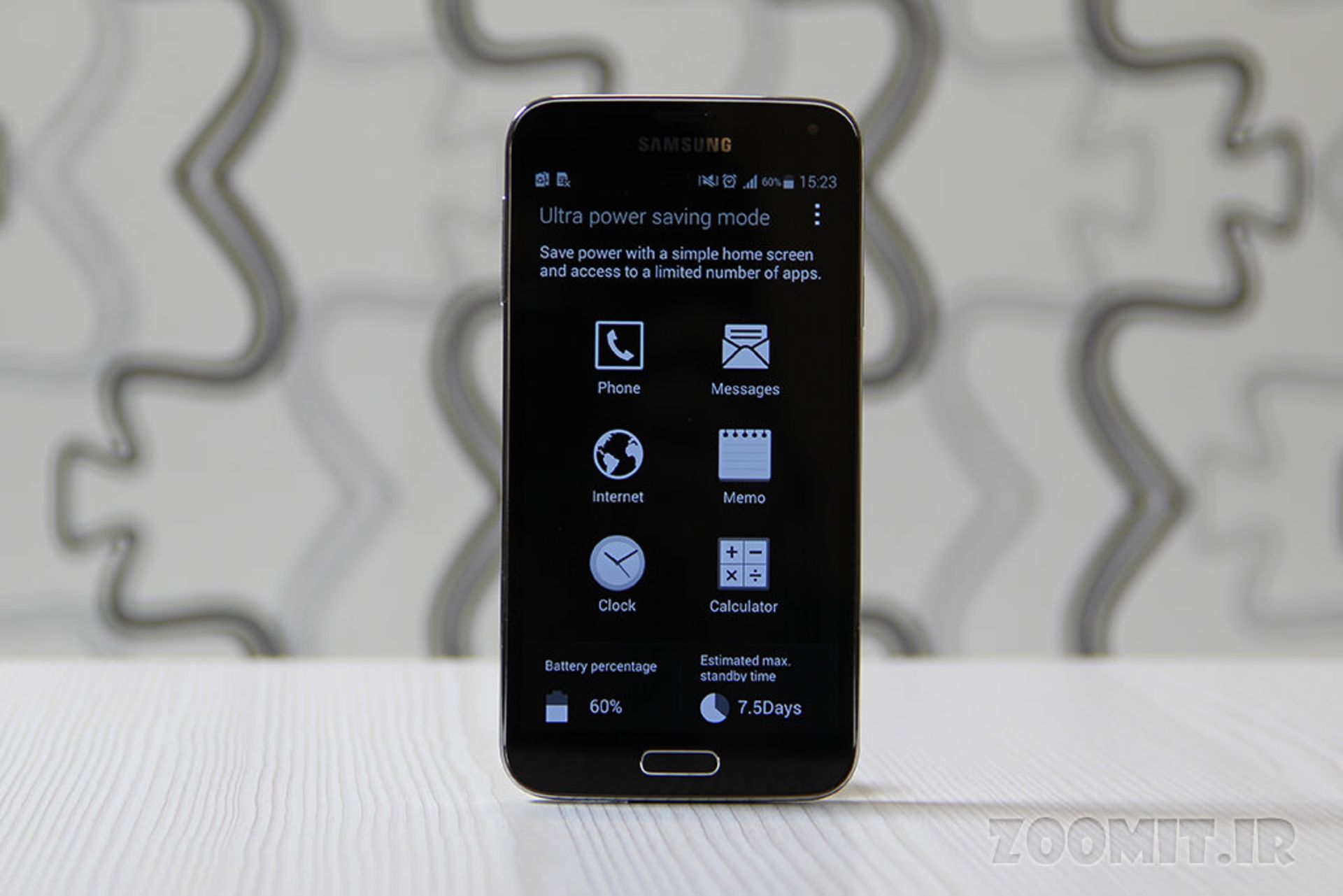 از دیگر ویژگیهای نرمافزاری جذاب گلکسی اس 5 میتوان به قابلیت Ultra Power Saving اشاره کرد. با فعالکردن این قابلیت، رابط کاربری بهطور کامل تغییر شکل داده (این تغییر حالت چند ثانیهای طول میکشد!) و شما ناگهان با صفحهای سیاهوسفید و ساده مواجه میشوید که تنها به چند قابلیت کلیدی مثل برقراری تماس تلفنی، ارسال پیامک، مرورگر اینترنت، ماشینحساب و... دسترسی دارید. دیگر خبری از تنظیمات پیشرفته و رابطکاربری رنگارنگ و ویجتها و چندین صفحه خانگی نیست. این حالت میتواند در مواقع اضطرار که با کمبود شارژ باتری مواجه هستید کارآمد باشد؛ چرا که تأثیر بسیار زیادی بر مصرف انرژی توسط دستگاه میگذارد و حتی میتواند آن را تا ۴۸ ساعت در حالت sleep روشن نگاه دارد.