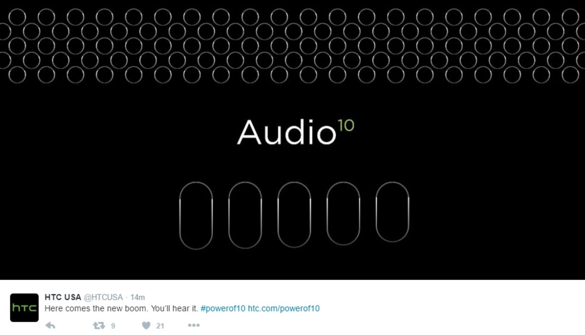 صفحه‌ی توئیتر شرکت اچ‌تی‌سی امروز با انتشار تیزری، وجود قابلیتی مشابه BoomSound در تلفن هوشمند اچ‌تی‌سی ۱۰ را تایید کرد. با زومیت همراه باشید.