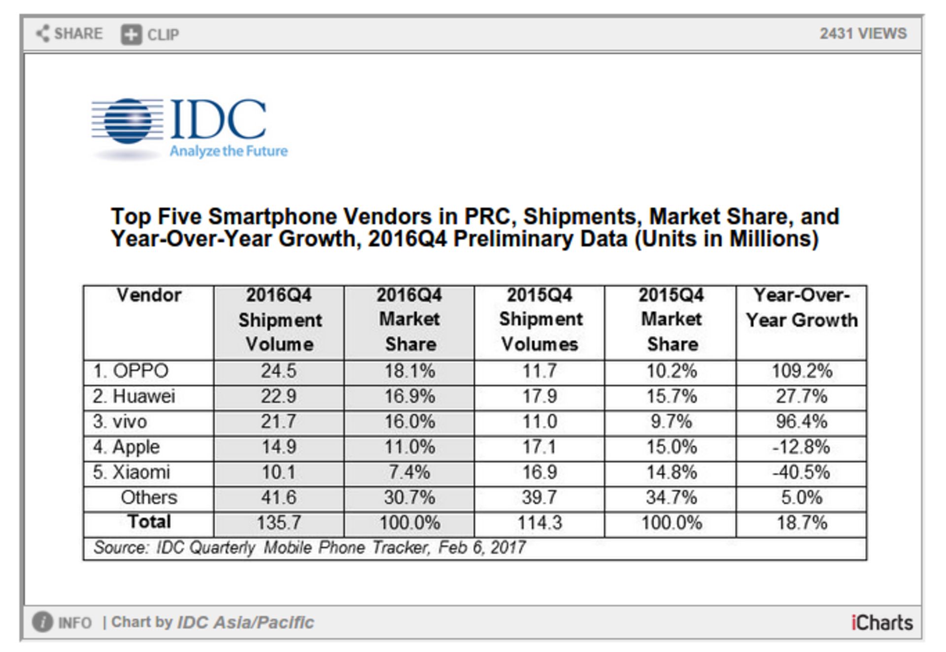 با توجه به گزارش جدیدی از طرف شرکت تحقیقاتی IDC، کمپانی اوپو (Oppo) هم‌اکنون به‌عنوان برترین بازیگر بازار گوشی‌ هوشمند در چین شناخته می‌شود. این کمپانی در سال ۲۰۱۶ موفق شده است ۷۸.۴ میلیون گوشی هوشمند در چین به فروش برساند. این میزان فروش باعث شده است سهم اوپو در بازار مورد اشاره به ۱۶.۸ درصد برسد.