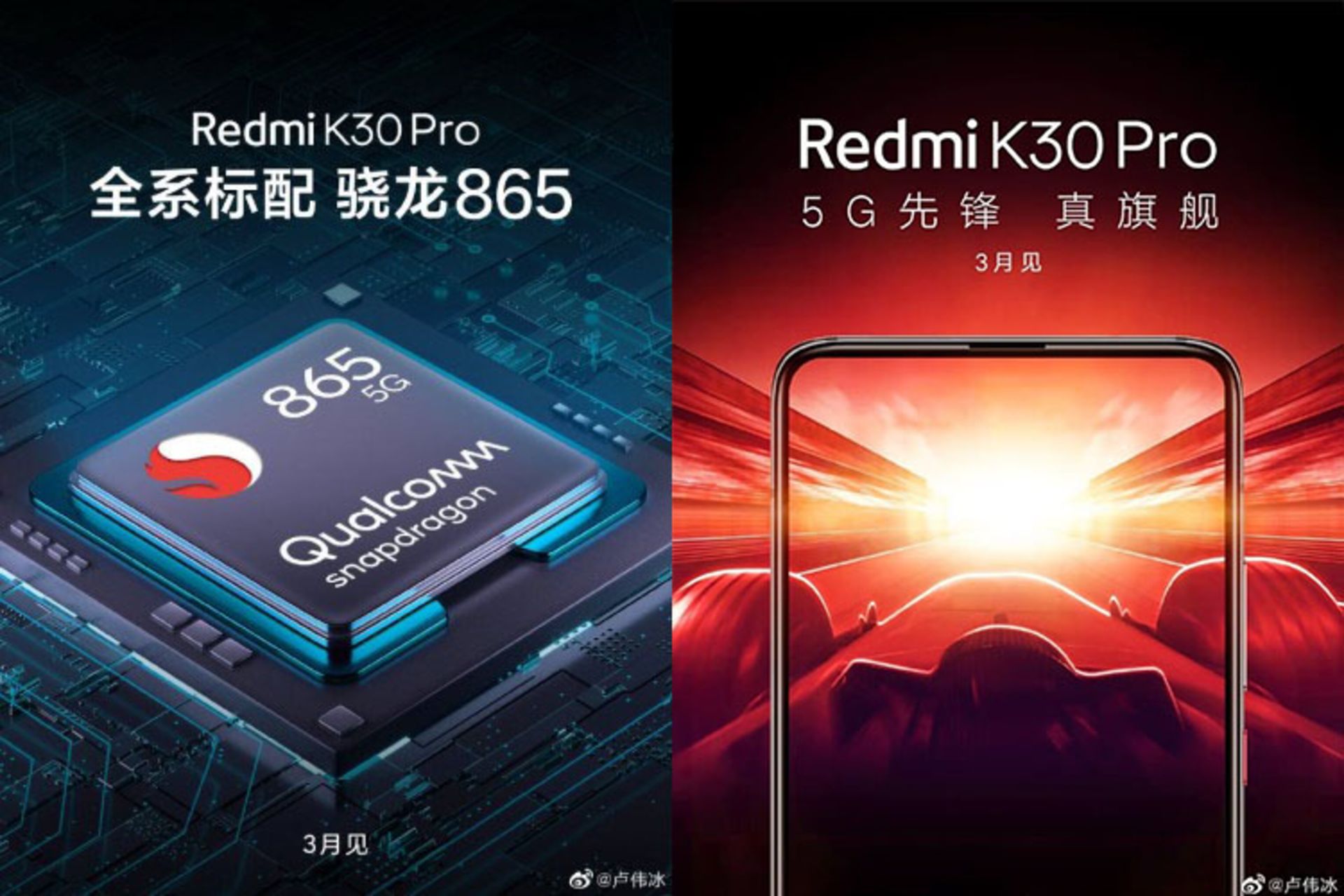 لو ویبینگ، قائم مقام مدیرعامل شیائومی و مدیر برند ردمی با انتشار دو پوستر در شبکهی اجتماعی ویبو چین تأیید کرد که گوشی هوشمند ردمی K30 پرو (Redmi K30 Pro) در ماه مارس (اواخر اسفندماه) با بهرهمندی از تراشهی قدرتمند اسنپدراگون ۸۶۵ کوالکام و قابلیت پشتیبانی از نسل پنجم شبکههای مخابراتی (5G) معرفی میشود.