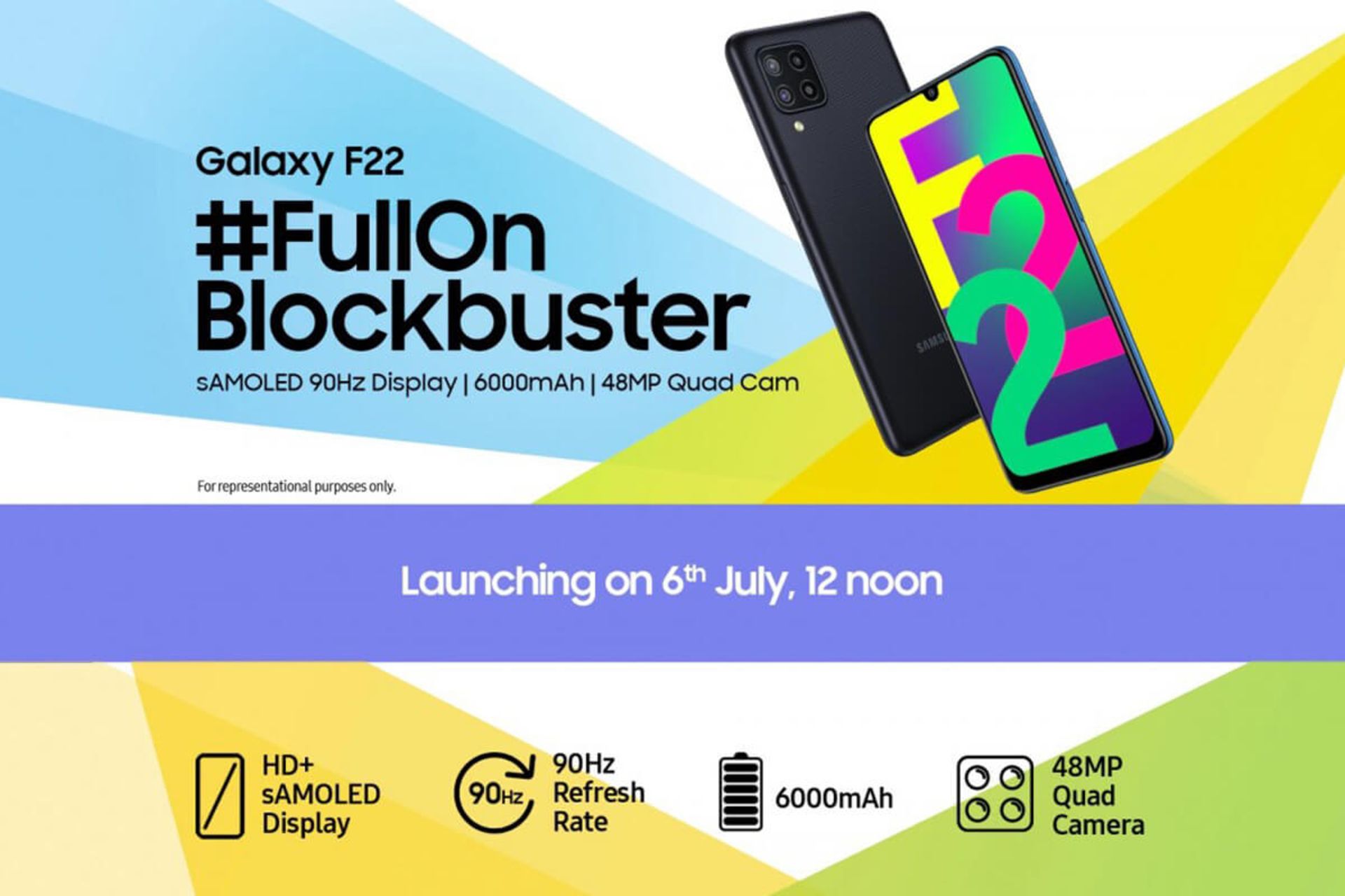 گوشیهای خانواده F سامسونگ بیشتر برای بازار هند طراحی میشوند و گلکسی F22 نیز از این قاعده مستثنی نیست. غول فناوری کرهای ۶ جولای (۱۵ تیر) این گوشی را رونمایی خواهد کرد و صفحه تیزر تبلیغاتی پلتفرم تجارت الکترونیکی Flipkart مشخصات اصلی آن را تأیید کرده است.
