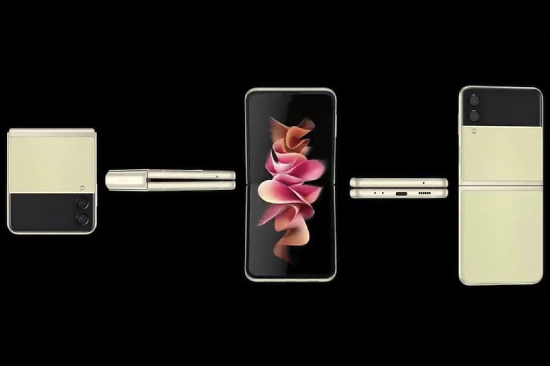 در این ویدئو ابتدا پنل جلویی دورنگ گلکسی زد فلیپ ۳ نمایش داده میشود که محل قرارگیری نمایشگر خارجی ۱٫۹ اینچ و دوربین دوگانه ۱۲ مگاپیکسلی با حسگرهای معمولی و فوق عریض است. علاوه بر این یک پورت USB-C، اسپیکر در پایین قاب، حسگر اثر انگشت خازنی و کلیدهای صدا در قاب سمت راست آن قرار دارند. اسلات سیمکارت ای گوشی در سمت چپ قاب قرار گرفته است.