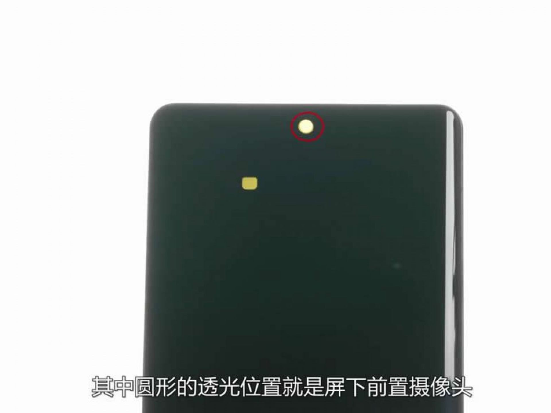 با نگه داشتن گوشی در مقابل نور، میتوان حفره دوربین زیر نمایشگر را مشاهده کرد. در واقع دو حفره قابل دیدن وجود دارد که حفره دایرهای میانی جایگاه قرارگیری دوربین سلفی است و طرح خاص شکلگرفته توسط پیکسلها برای عبور نور تعبیه شده است. حفره مربعی که در این تصویر دیده میشود، نقش خاصی در عبور نور ندارد و در اصل برای حسگرهای مجاورت و نور محیط طراحی شده است.
