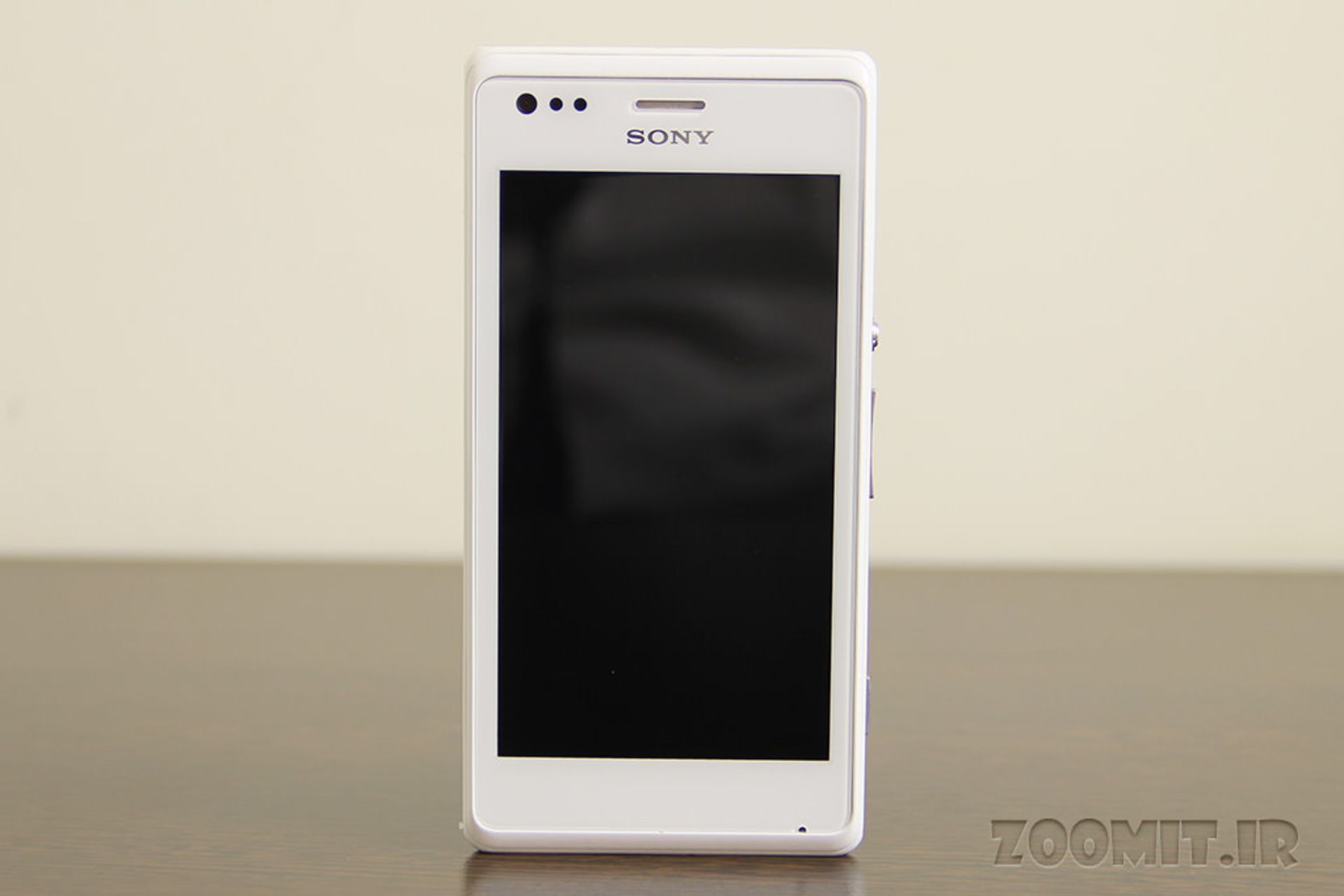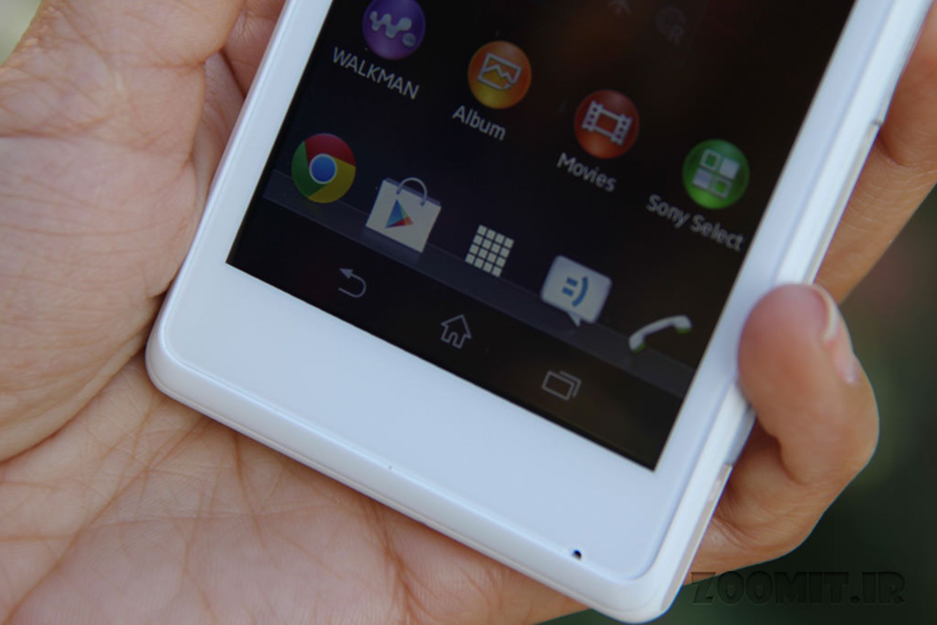 در قسمت جلویی، با یک صفحه نمایش 4 اینچی روبرو هستیم که در محاصره حاشیه‌های نسبتا بزرگ قرار گرفته است. حاشیه‌های تلفن از روبرو، خصوصا در قسمت پایینی شاید اندکی در ذوق کاربر بزند. حاشیه پایین گوشی محل قرار گیری دکمه‌های اصلی است. اما در قسمت پایین این مدل، سونی به جای دکمه‌های لمسی و فیزیکی تنها به یک چراغ لوزی شکل نه چندان بزرگ اکتفا کرده که وقتی خاموش است به هیچ وجه دیده نمی‌شود تا طراحی ظاهری دستگاه را بر هم نزند. از نظر ما طراحی دکمه‌های لمسی در این قسمت و یک چراغ LED بزرگ‌تر، می‌توانست طراحی زیباتری را به دنبال داشته باشد. در قسمت بالایی نیز در کنار نام سونی که در وسط حک شده است، دوربین جلو، سنسورهای مختلف و اسپیکر مخصوص مکالمه تلفنی قرار دارد.