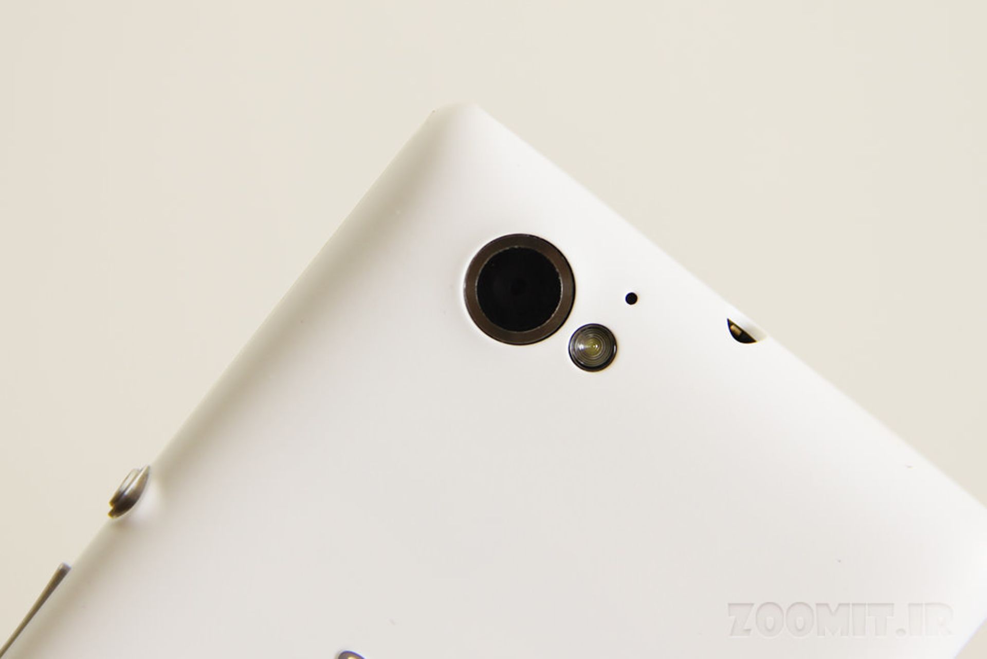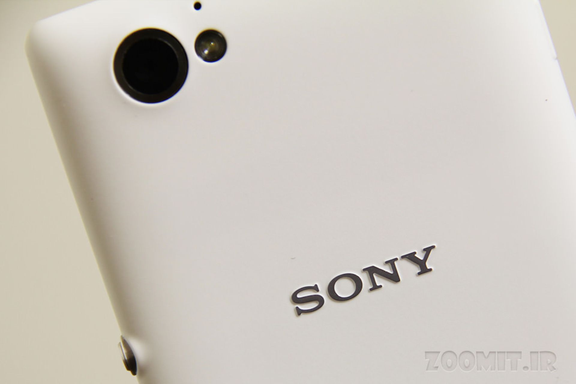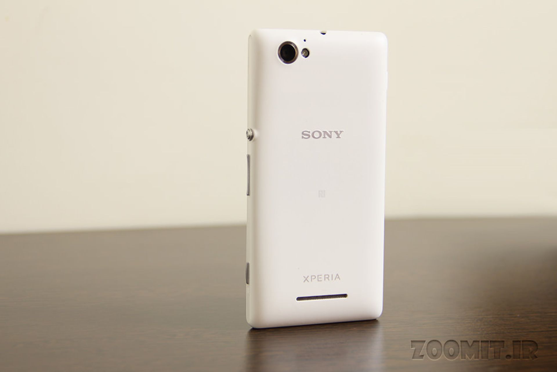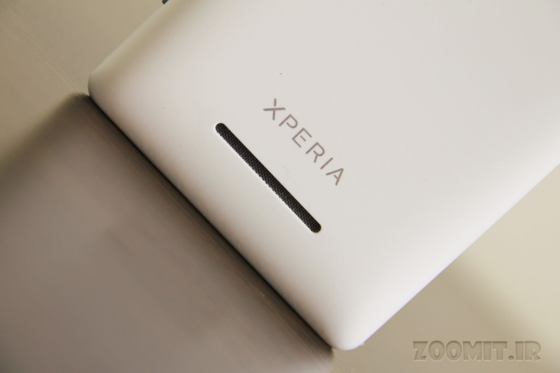 در پشت گوشی، دوربین 5 مگاپیکسلی اصلی با یک فلاش LED قرار دارد که بررسی کیفیت دوربین را به بخش مخصوص آن ارجاع می‌دهیم. در بخش میانی پشت گوشی، لوگوی سونی با رنگ طوسی به صورت برجسته حک شده است و مقداری پایین‌تر لوگوی XPERIA به چشم می‌خورد. در زیر این لوگو نیز خروجی بلندگوی مستطیل و نسبتا بزرگ گوشی قرار دارد که کیفیت صدای آن را نیز در ادامه بررسی خواهیم کرد. مهمترین مشکل در طراحی قسمت پشتی این مدل، محل قرارگیری بلندگو است به طوری که هنگام در دست گرفتن دستگاه، مسدود شدن خروجی بلندگوی آن توسط دستتان بسیار محتمل خواهد بود. البته این موضوع چندان حاد نیست و تاثیر زیادی بر صدای خروجی اسپیکرها ندارد.