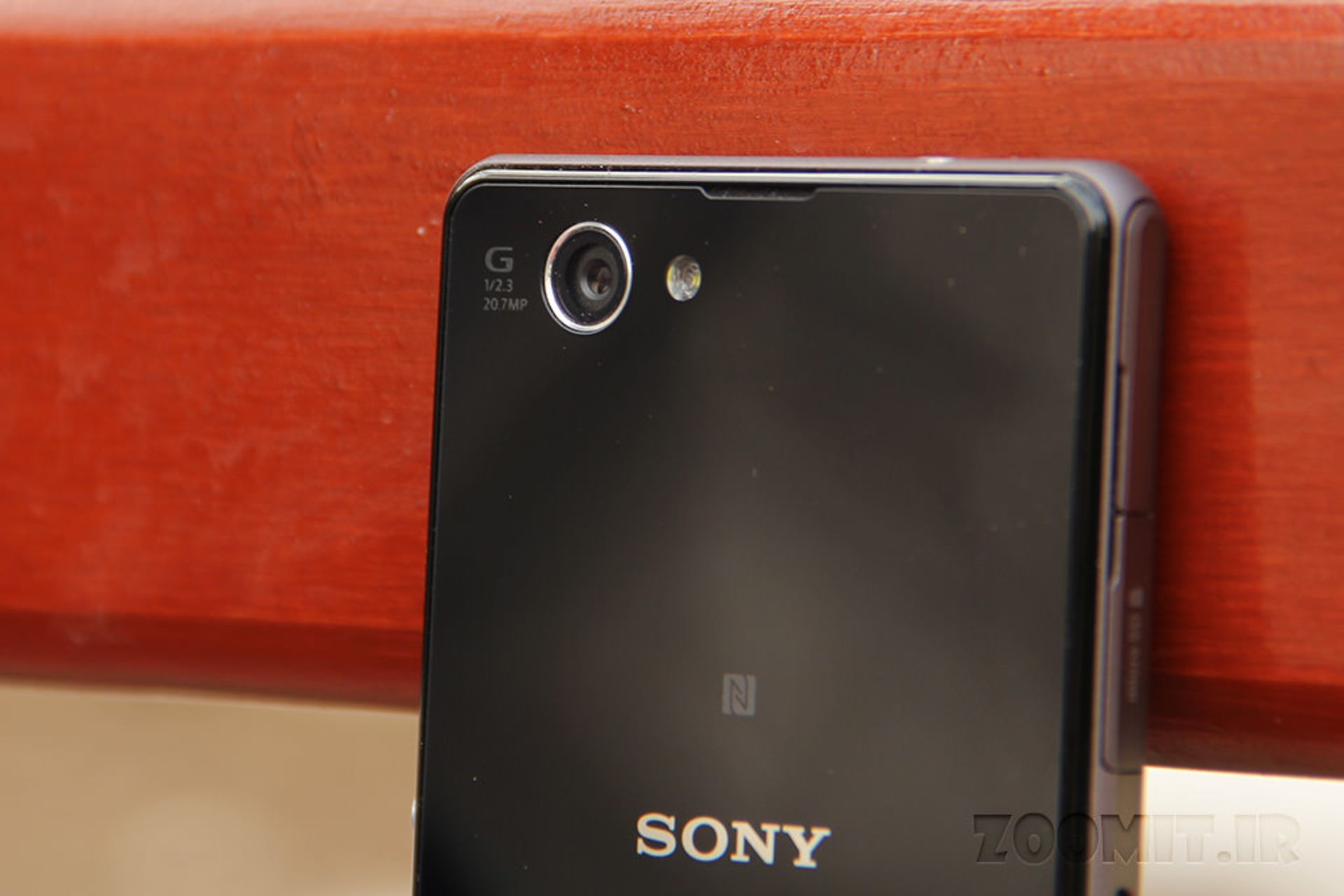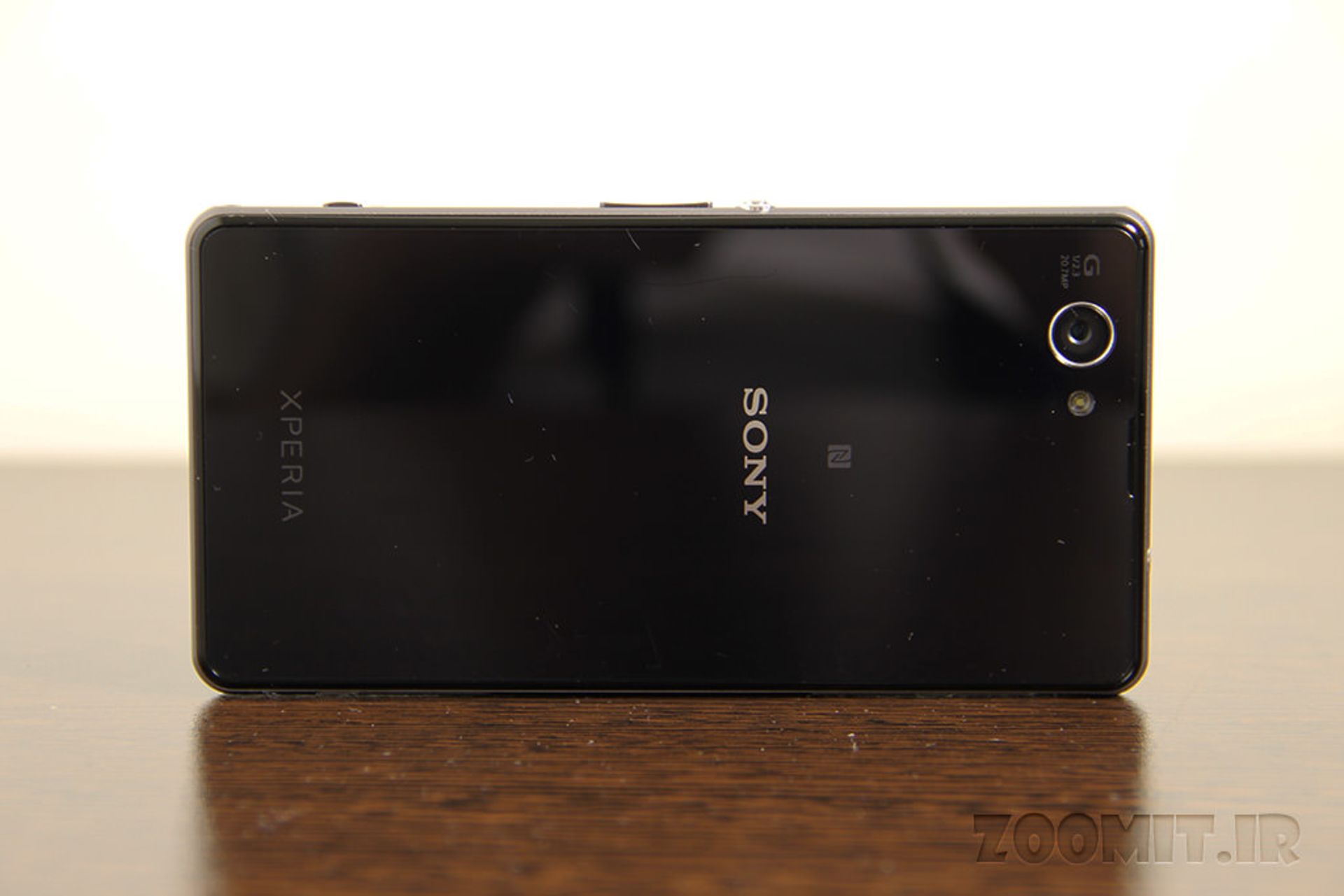 در پشت Z1 Compact لوگوی سونی نقش بسته و در بالای آن نیز علامت نشاندهنده محل قرارگیری ماژول NFC حک شده است. در پایین نیز لوگوی برند XPERIA قابل مشاهده است.