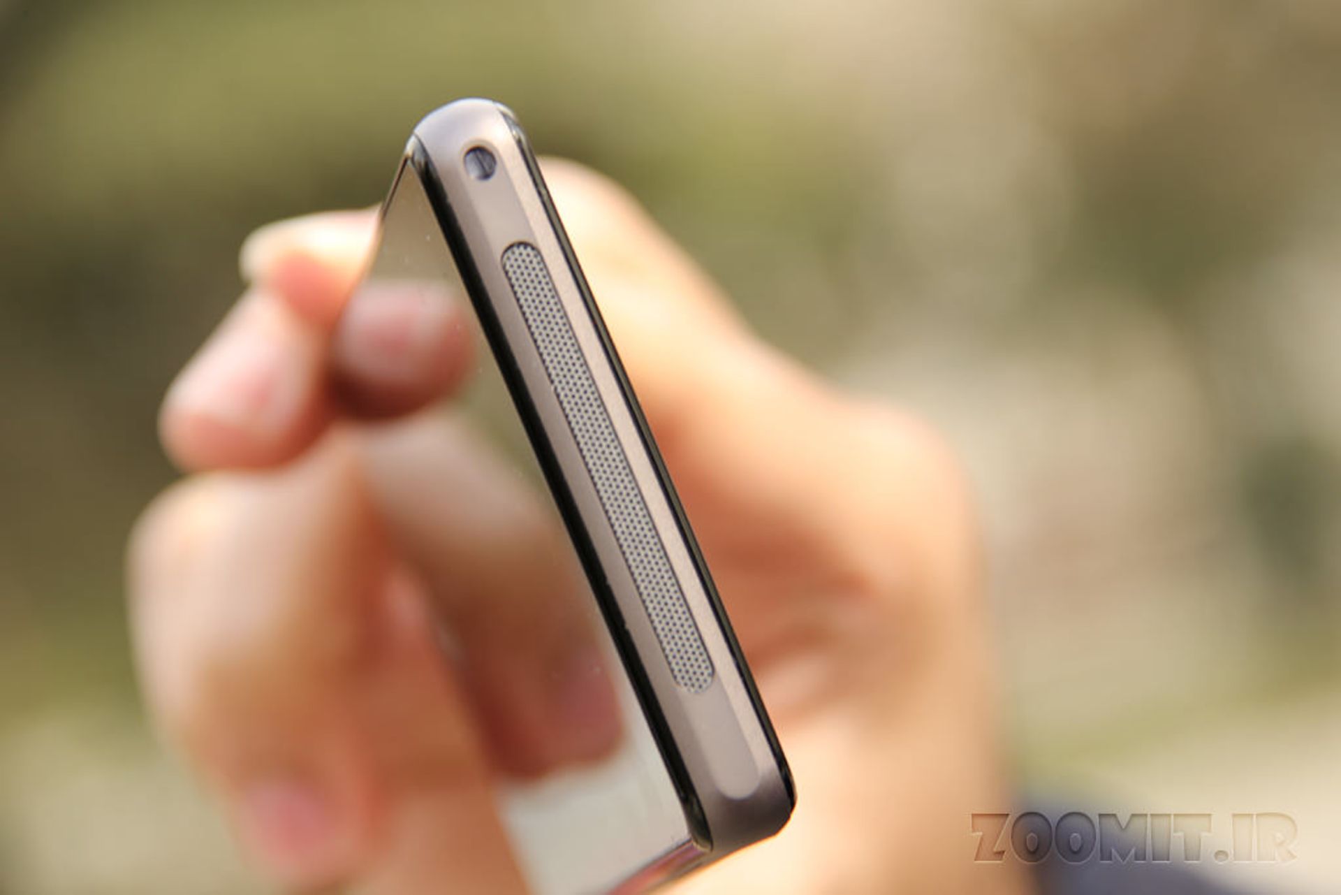 در گوشه سمت راست پایین نیز منفذهایی برای انداختن بند و غیره، جای داده شده که دیگر به نظر قدیمی میرسد و در کمتر تلفنی مورد استفاده قرار میگیرد! لبه پایین دستگاه دارای یک اسپیکر بزرگ است که کیفیت قابل قبولی داشته و طراحی زیبایی نیز دارد. لبه سمت چپ لبه درگاههای ورودی است. در پایین شیار میکروسیم قرار گرفته که روی آن را یک درپوش پوشانده است. کمی بالاتر از آن داک نسبتا بزرگی قابل مشاهده است که با رنگ و شکل فریم چنان همخوانی ندارد. کمی بالاتر به ترتیب درگاههای کارت حافظه microSD و microUSB قرار گرفتهاند که روی آنها نیز با درپوشهایی پوشیده شده است. در نهایت در لبه بالایی فقط جک هدفون 3.5 میلیمتر تعبیه شده است.