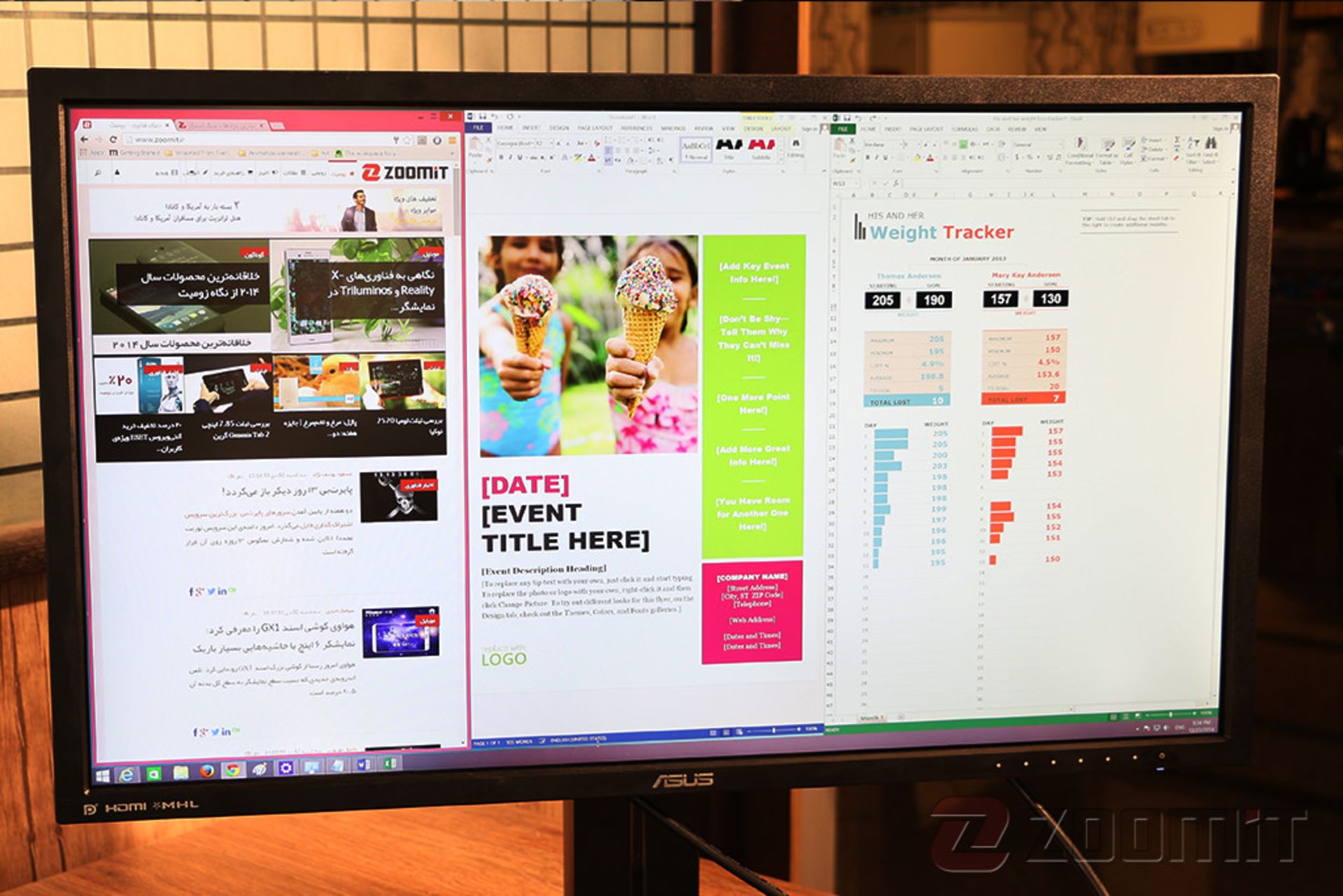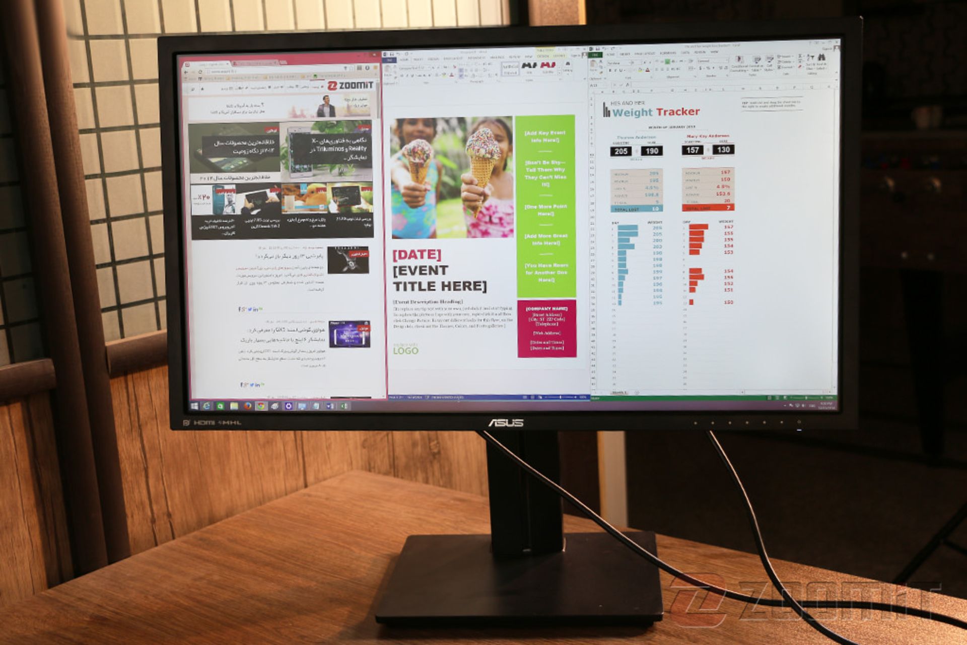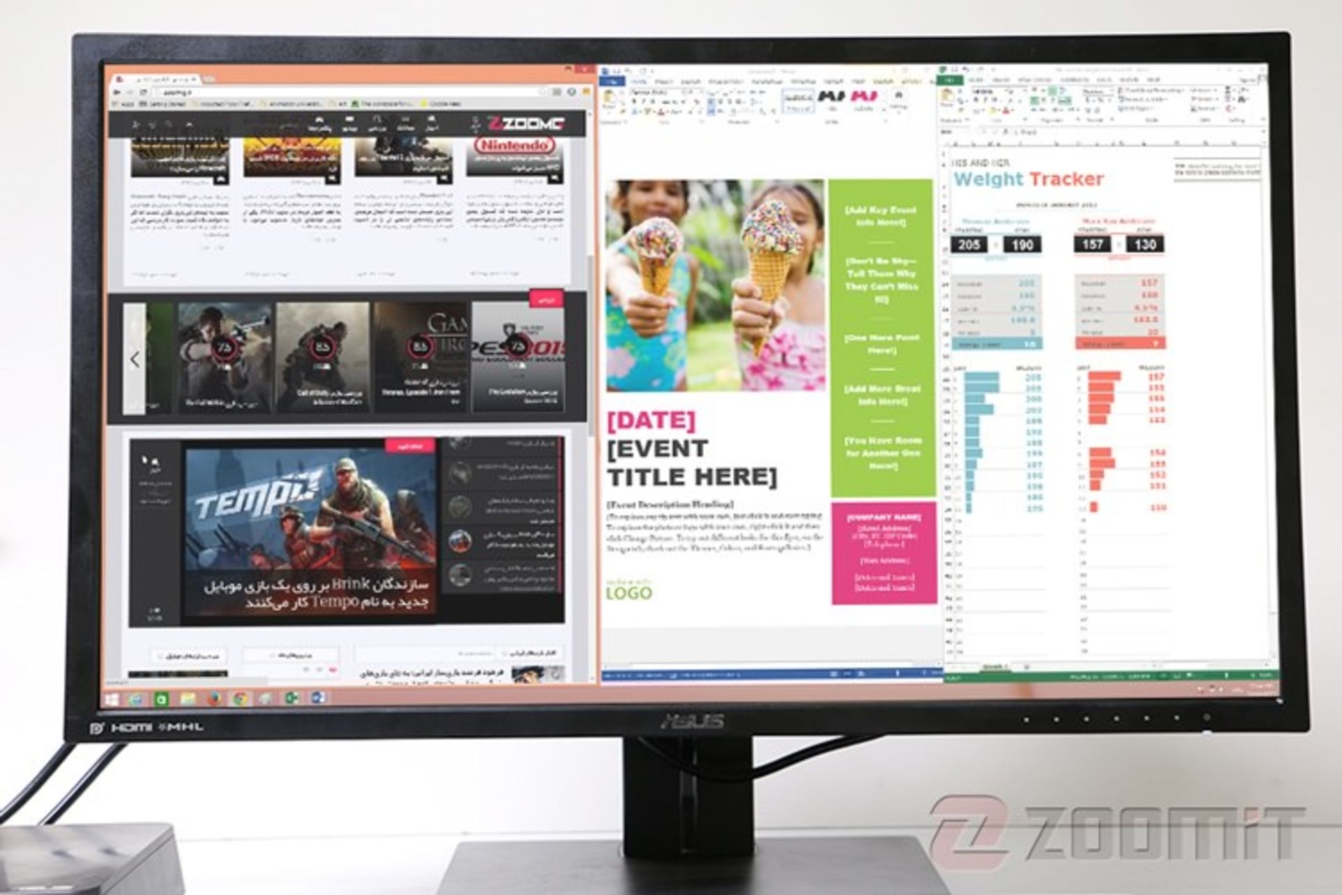 مانیتور ایسوس مدل PB287Q با وجود اینکه اولین نسل از مانیتورهای 4K این شرکت است اما از نظر کیفیت و وضوح تصویر در سطح بسیار خوبی قرار دارد. این نمایشگر میتواند برای خورههای بازی یا افرادی که نیاز به فضای کاری زیادی دارند عالی باشد. البته برای اینکه بتوانید بازی را در رزولوشن 4K اجرا کنید نیاز به یک کامپیوتر هیولا خواهید داشت؛ کامپیوتری که به جدیدترین و قویترین کارت گرافیکهای ساخت انویدیا یا AMD مجهز شده باشد و دیگر قطعات آن نیز توان پردازش ۴ برابر پیکسل بیشتر را داشته باشند. این یعنی برای تجربهی نهایت لذت تصویر در مانیتور PB287Q باید حدود ۸ میلیون تومان بابت سیستم گیمینگ خود هزینه کنید. اما مانیتورهای 4K تنها برای خورههای گیم ساخته نشدهاند. اگر نیاز به فضای کاری زیاد دارید یا تا پیش از این دو یا سه مانیتور را درکنار یکدیگر استفاده میکردید حالا میتوانید با یک مانیتور 4K فضای به مراتب بیشتر را در قالب یک مانیتور دراختیار داشته باشید و چندین سند و صفحهی مختلف را کنار یکدیگر باز کرده و نهایت بهرهوری را تجربه کنید.