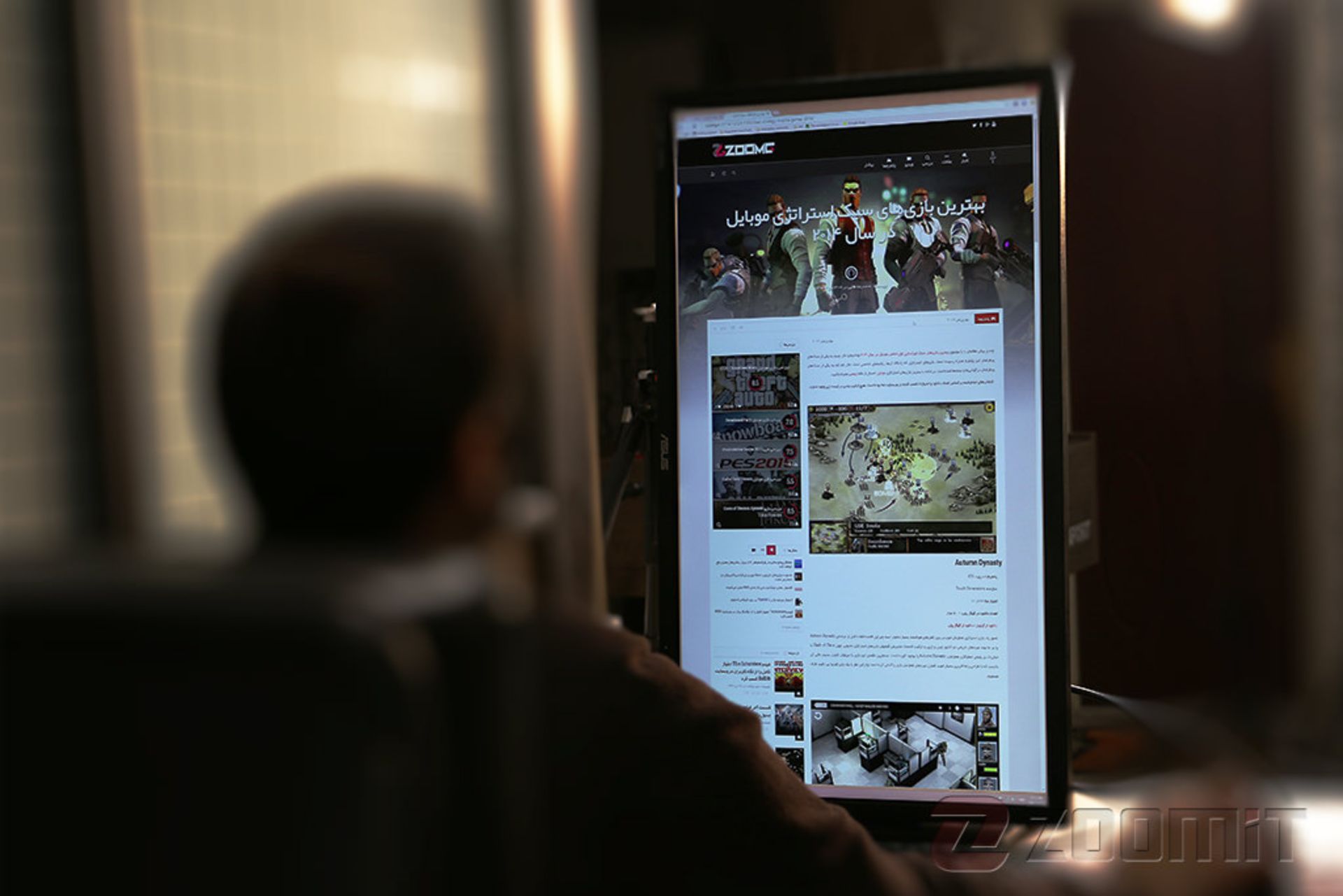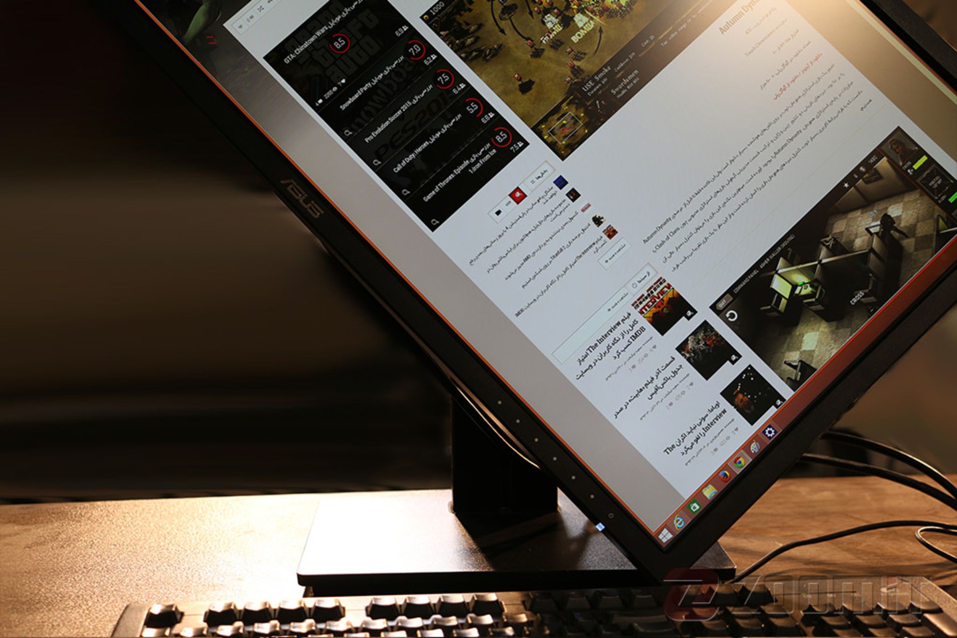 صفحهنمایشهای TN از قدیم با مشکل زاویهی دید دستوپنجه نرم میکردهاند و همیشه نیز مغلوب نمایشگرهای IPS شدهاند. البته با پیشرفت تکنولوژی زاویهی دید این پنلها نیز پیشرفت چشمگیری داشته است. زاویهی دید نمایشگر 4K ایسوس به مراتب بهتر از نمایشگرهای رایج مجهز به پنل TN است، اما بااینحال باز هم اگر با زاویه به نمایشگر نگاه کنید از کیفیت تصویر کاسته شده و رنگها کمی در هم آمیخته میشوند. پس اگر مایل هستید تا بهترین تصویر را در این نمایشگر تجربه کنید، چارهای جز تنظیم صحیح آن و قرار دادن نمایشگر درست در مقابل دید خود ندارید. البته این بدین معنی نیست که با تغییر چند درجهایی نمایشگر، با تصویر بهم ریخته روبهرو میشوید؛ حتی تا زاویه حدود ۱۰۰ درجه نیز تغییرات ایجاد شده در نمایشگر کم هستند. به هر حال نمیتوانید از یک نمایشگر مجهز به پنل TN انتظار زاویهی دید مشابه پنلهای IPS را داشته باشید.