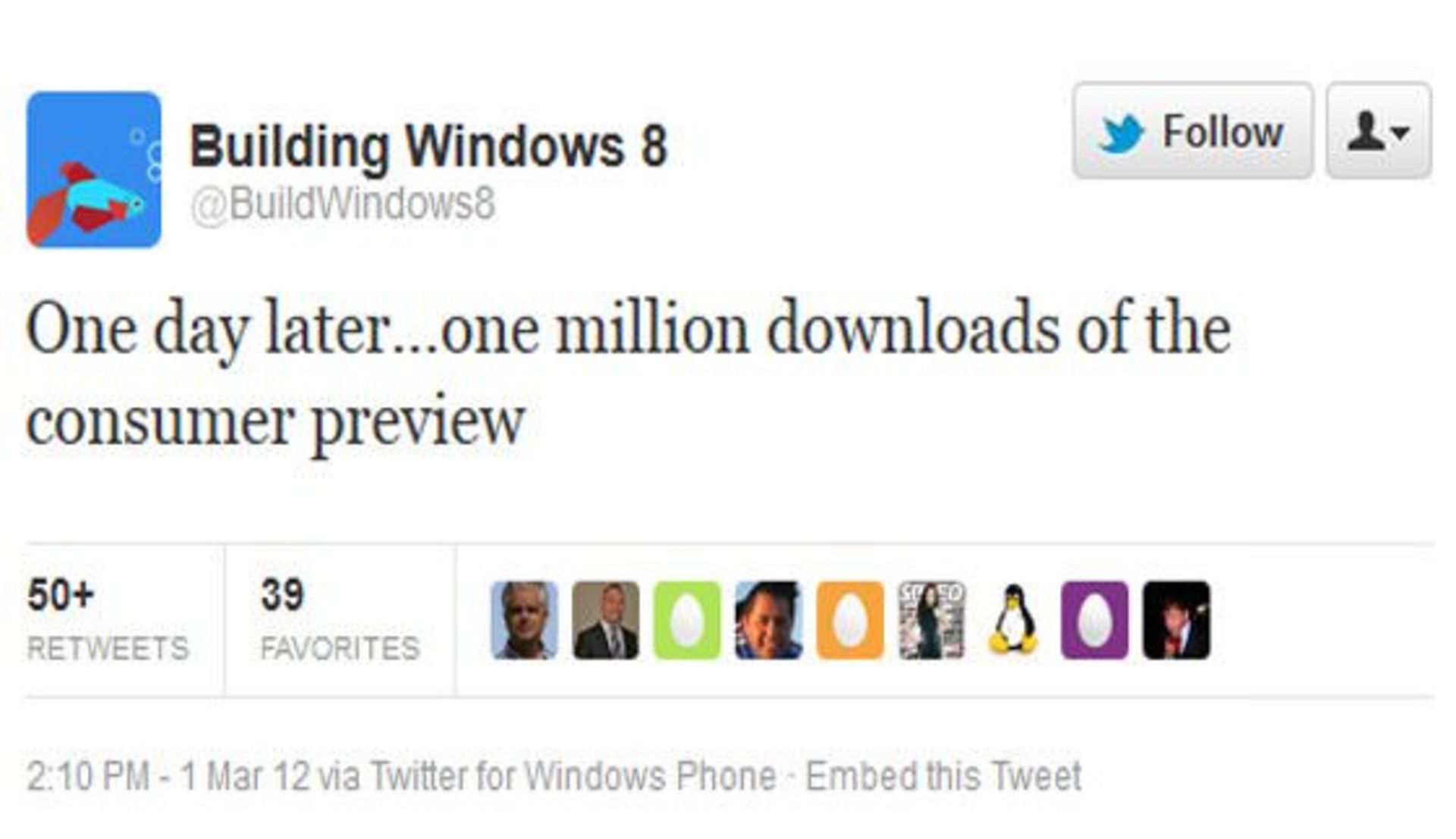 روز گذشته مایکروسافت با افتخار از طریق توییتر خود، دانلود یک میلیونی ویندوز 8 تنها در روز اول را اعلام کرد. نسخه آزمایشی همزمان با کنفرانس معرفی این سیستم عامل در کنگره جهانی موبایل در بارسلونا در دسترس قرار گرفت.