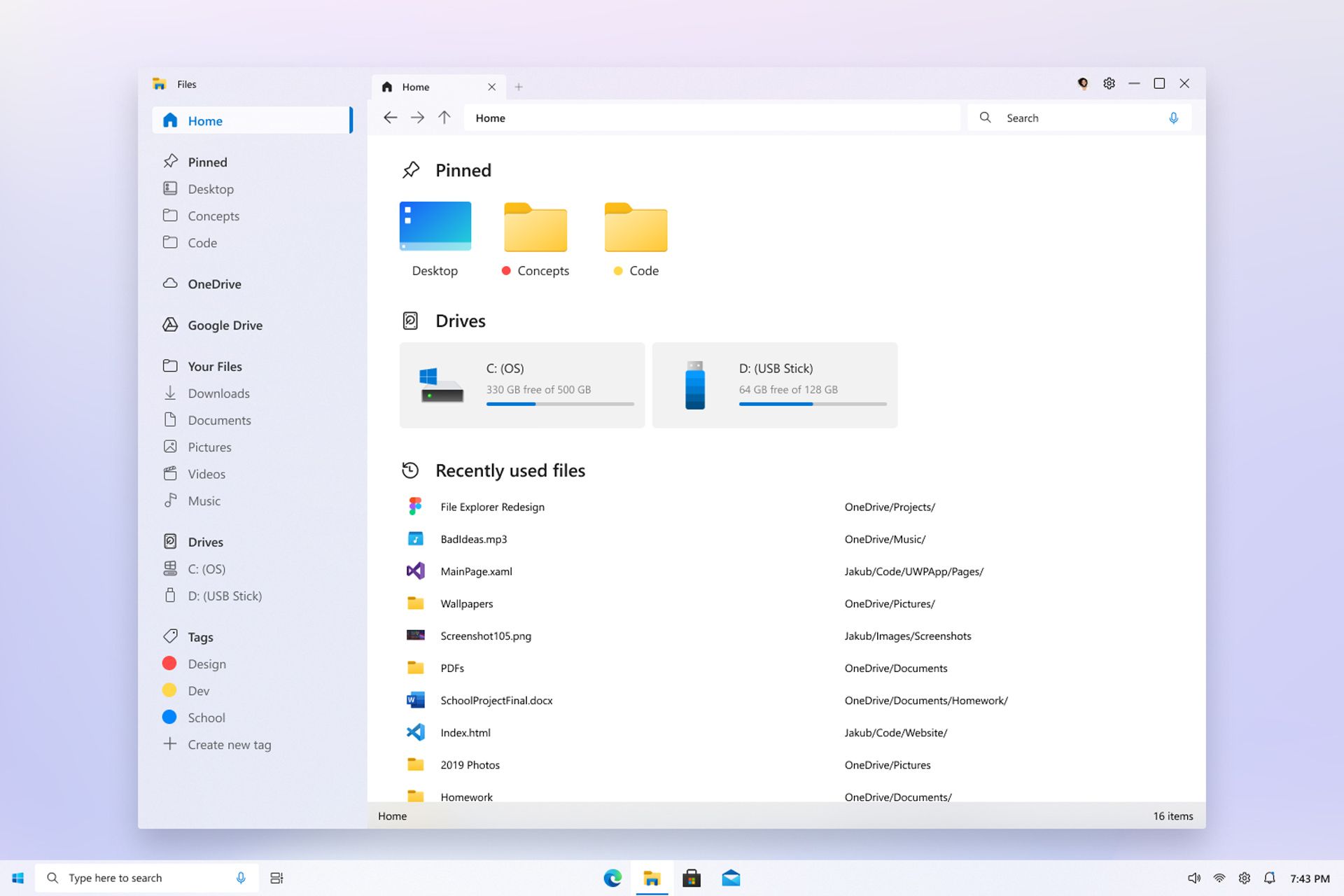 طراحی مفهومی جدید که نخستین بار توسط Neowin رؤیت شد، بهخاطر سادگی و کاربردیبودن جلب توجه میکند. صفحهی اصلی فایل اکسپلورر شامل فضایی است که میتوانید آیتمهای پینشده، درایورها و فایلهایی را که اخیرا استفاده کردهاید مشاهده کنید. صفحهی اصلی فایل اکسپلورر در عین ساده بودن، هرآنچه را که نیاز دارید جلوی چشم شما قرار میدهد.
