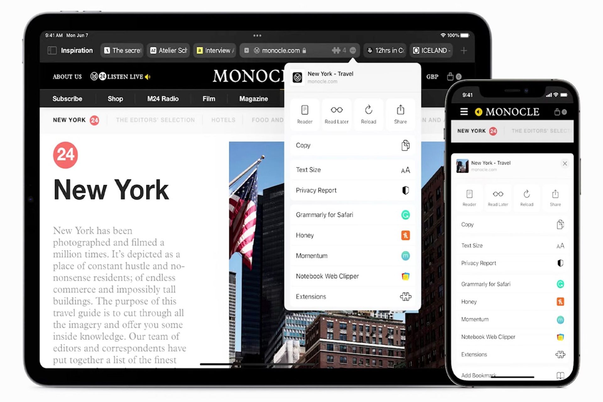 اپل در کنار اعلام بهروزرسانیهای مربوط به حفظ حریم شخصی در جریان رویداد توسعهدهندگان (WWDC 2021)، از قابلیتهای جدیدی برای مرورگر سافاری رونمایی کرد. از جمله این قابلیتها میتوان به اضافه شدن افزونههای وب مرورگر سافاری به آیپد و آیفون اشاره کرد.