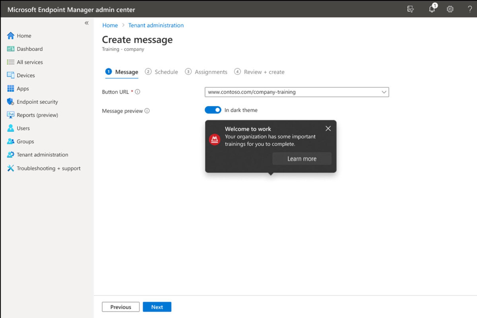 مدیران آیتی میتوانند این پیامها را در فضای Microsoft Endpoint Manager پیکربندی و نحوه و تعداد دفعات نمایش آنها را برای افراد سازمان مشاهده کنند. علاوهبراین، امکان برچسبگذاری لوگو شرکت درکنار پیامها یا قراردادن لینک آدرسهای اینترنتی سازمان در پیامها وجود دارد. این قابلیتها میتوانند برای آموزش به افراد سازمان یا ارسال نوتیفیکیشنهای فوری بسیار مفید باشند.