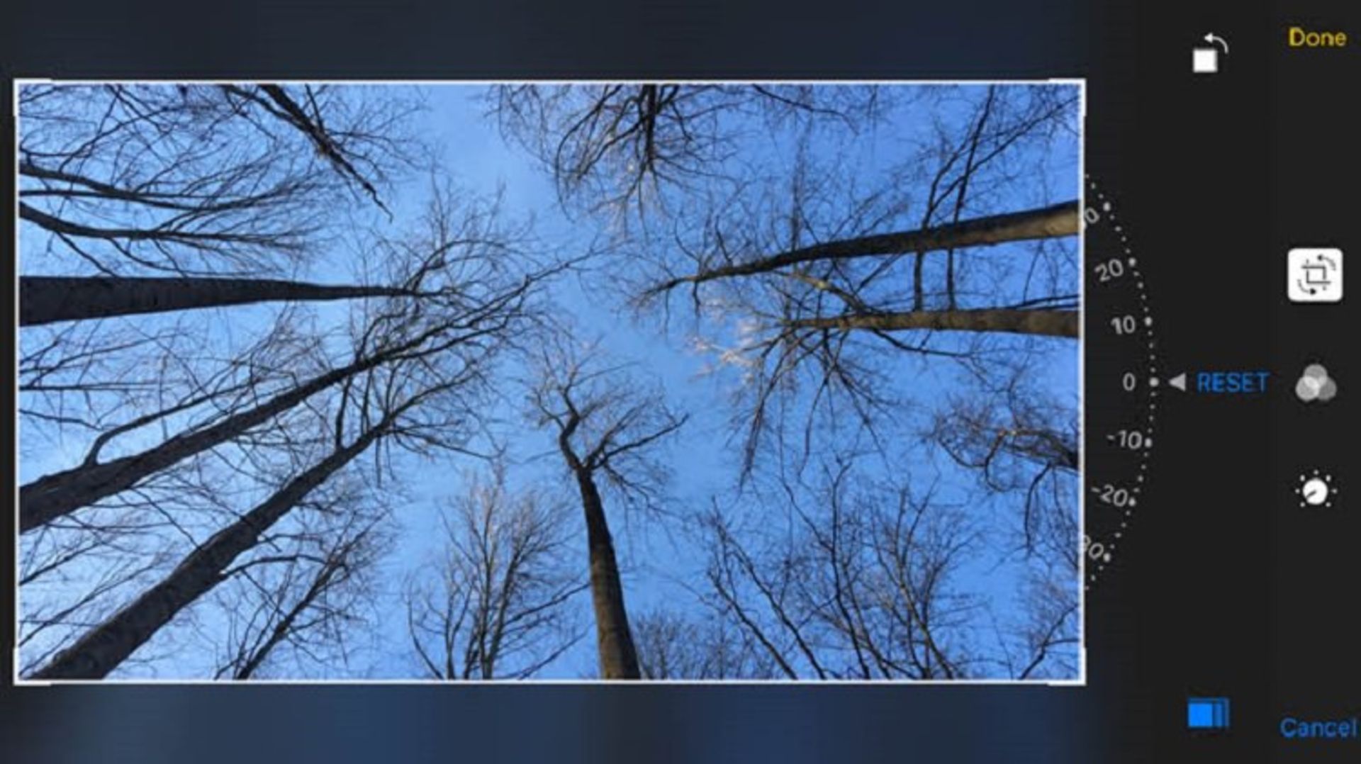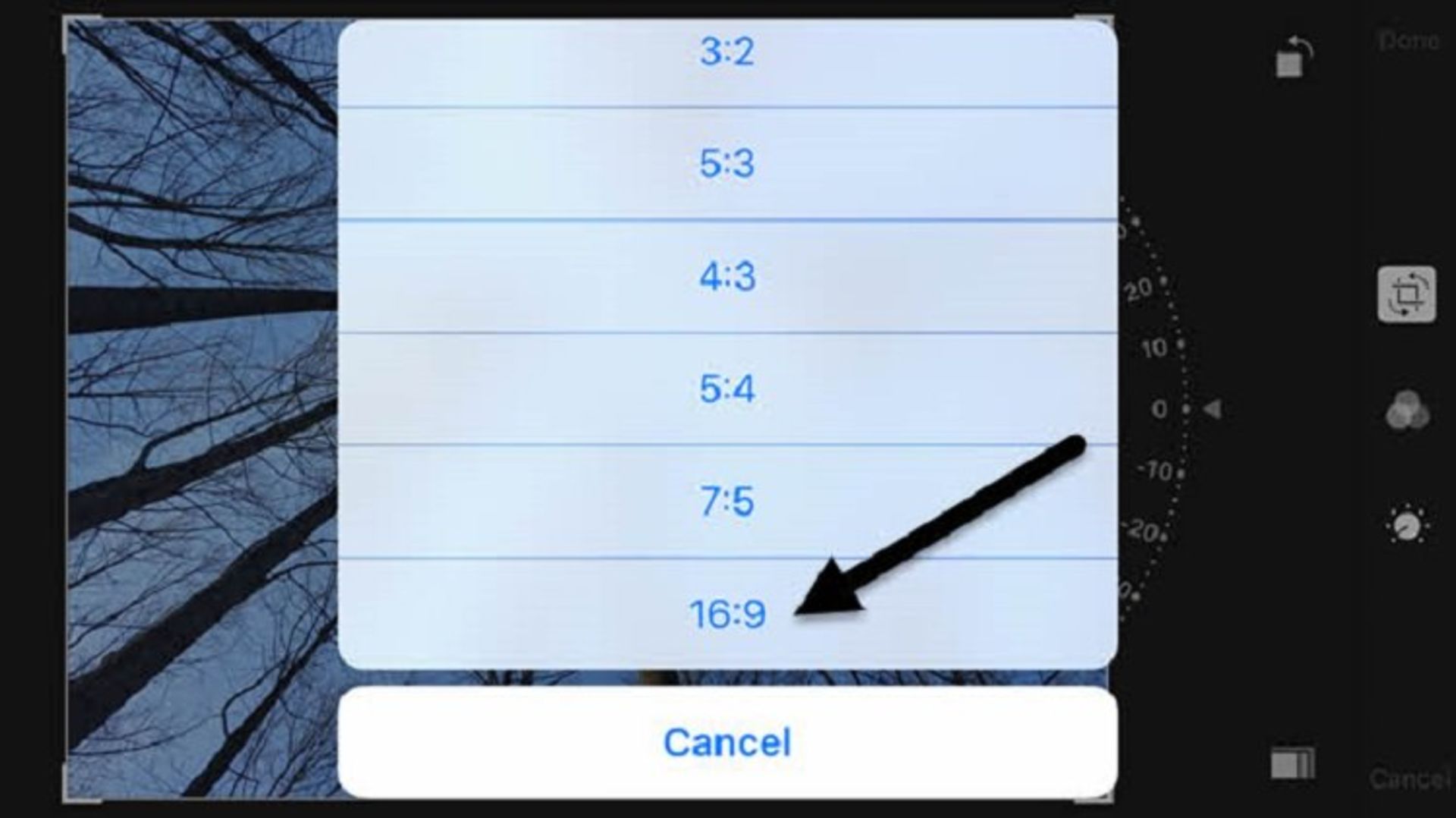 در پلتفرم iOS دو راه حل وجود دارد که عکسهای خود را با نسبت ۱۶:۹ ثبت کنید. راه حل اول مربوط به قسمت ویرایش تصویر و راه حل دوم مربوط به زمان گرفتن عکس است. در این حالت اگر تصویر شما در نسبت ابعادی ۴:۳، رزولوشن ۴۰۳۲ در ۲۲۶۸ داشته باشد، در نسبت ابعادی ۱۶:۹ این رزولوشن، ۳۸۴۰ در ۲۱۶۰ خواهد بود.