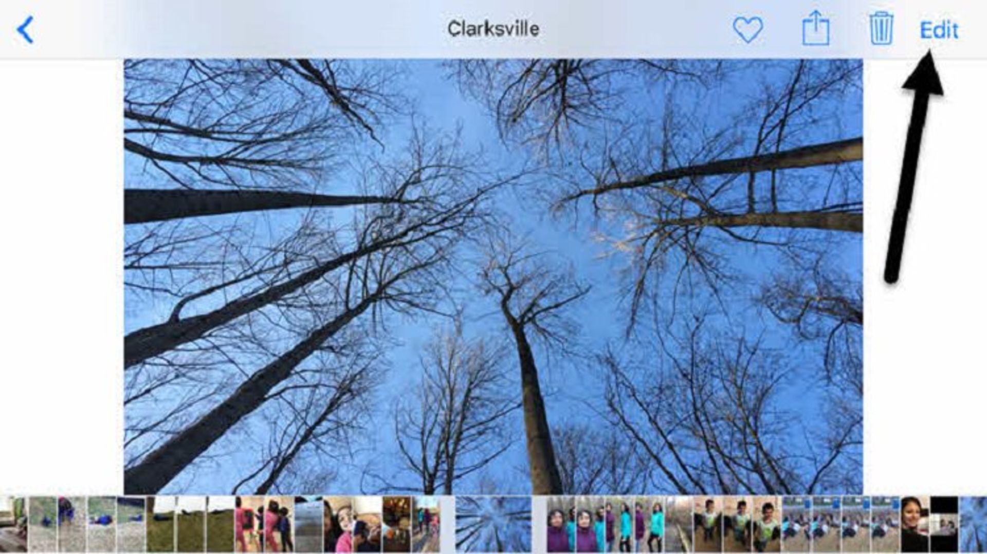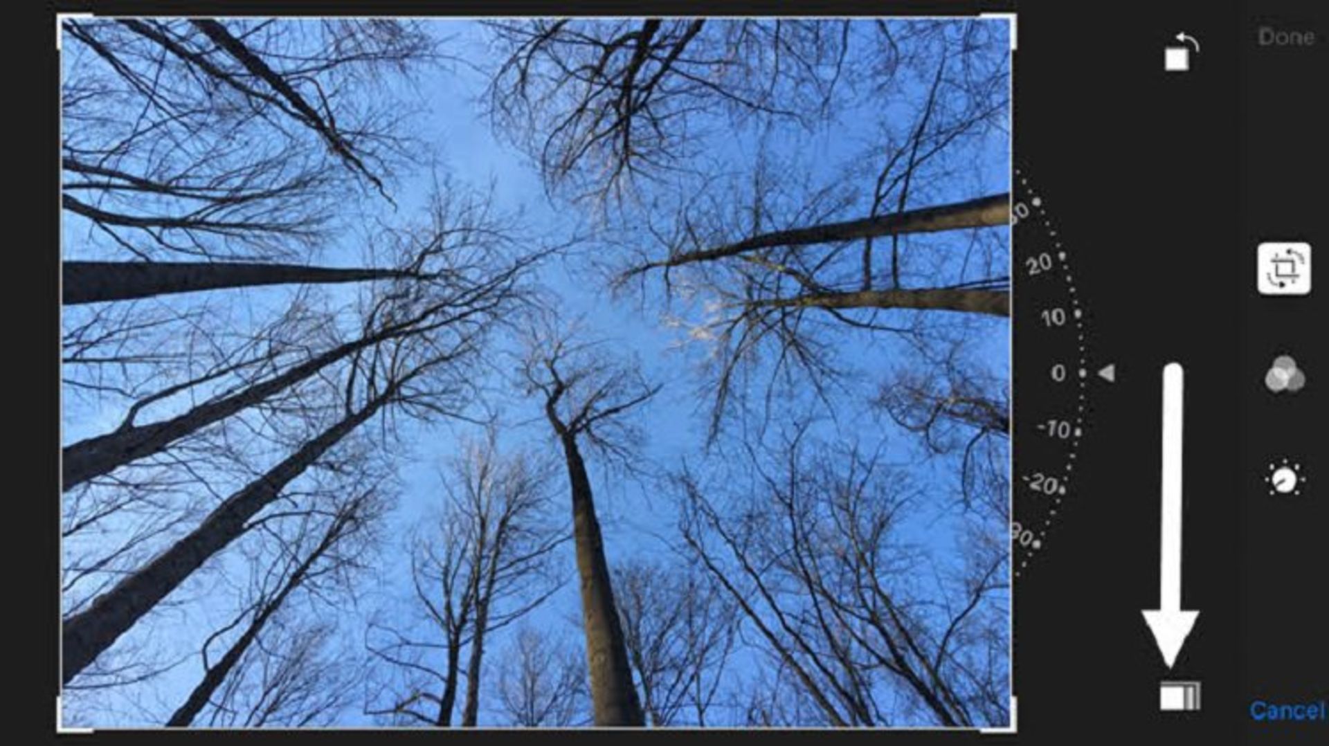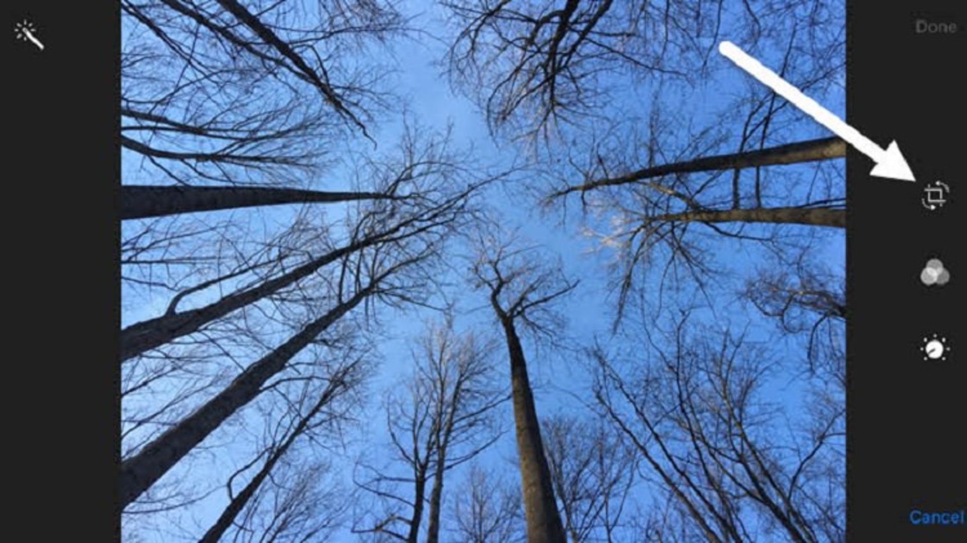 با ضربه روی گوشه بالای سمت راست وارد گزینهی Edit شوید. حالا روی اولین آیکون ضربه بزنید تا قسمت برش و چرخش عکس باز شود.