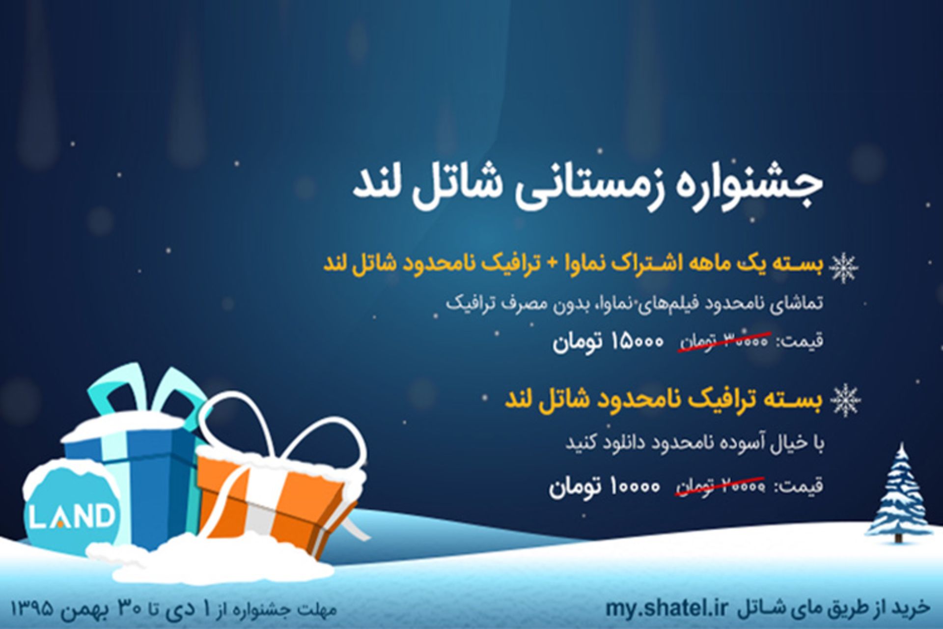 کاربران گرامی میتوانند از تاریخ ۱ دی تا ۱ اسفند ۱۳۹۵ با شرکت در جشنواره زمستانی شاتللند و خرید بستهها از سایت مای شاتل، از تخفیف پنجاه درصدی استفاده کنند.