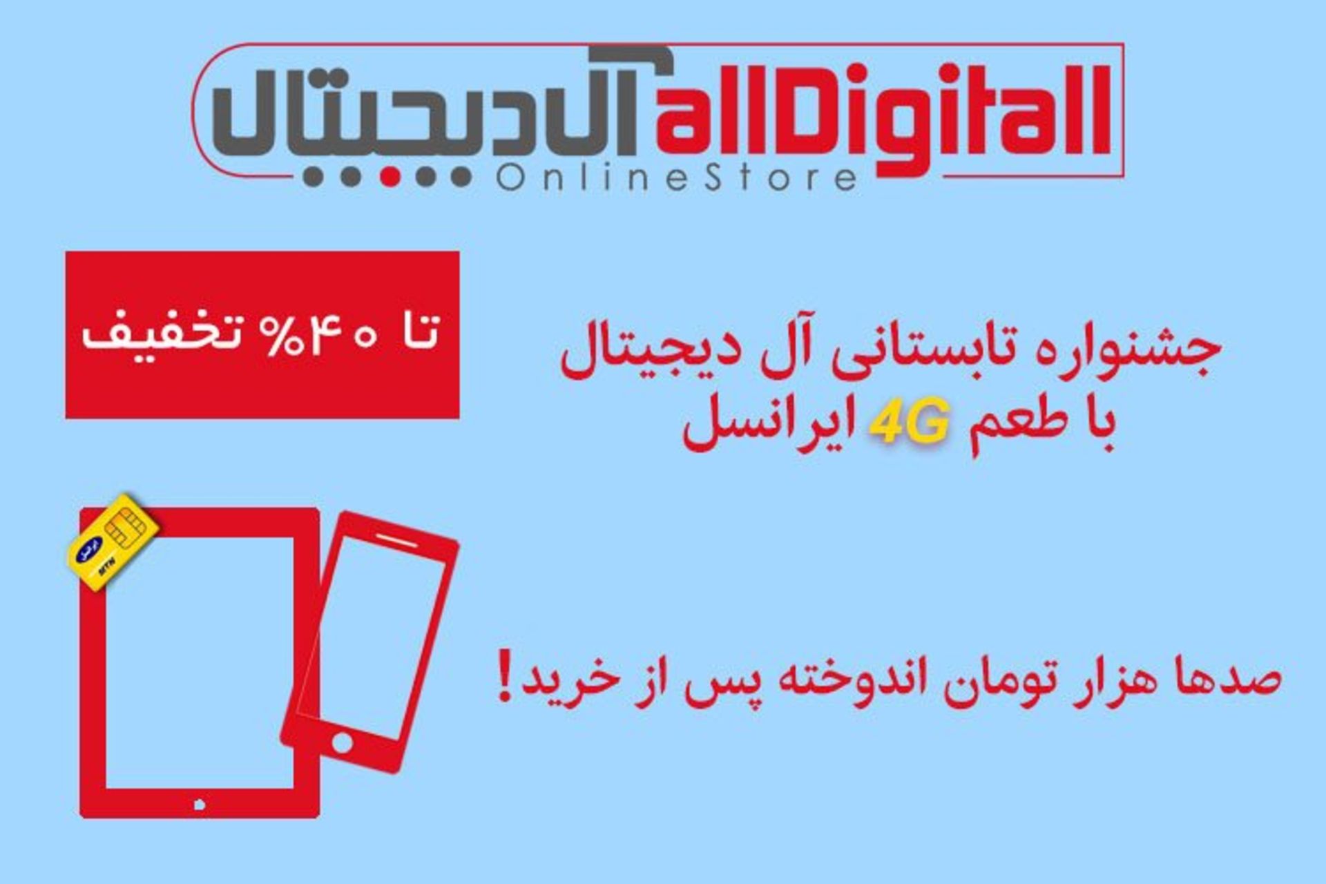 همچنین تا پایان تابستان با خرید هر موبایل یا تبلت از فروشگاه اینترنتی آل دیجیتال، یک سیم کارت به همراه اینترنت نسل ۴ را از ایرانسل هدیه بگیرید.
