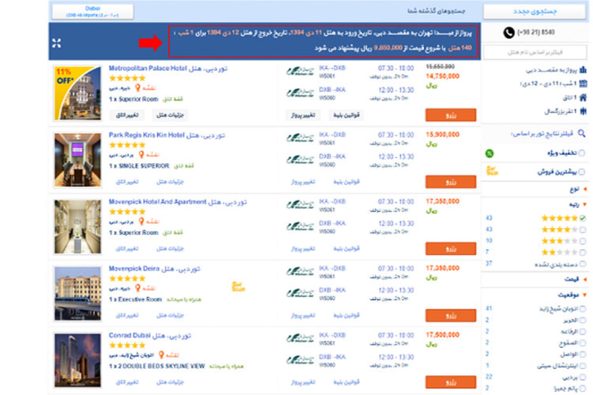 در قسمت جستجوی پرواز یا هتل، کافی است شهر مقصد، تاریخ رفتوبرگشت و تعداد همراهان را مشخص کنید تا با تعداد بیشماری انتخاب روبرو شوید، بهطور مثال در مسیر دبی، علاوه بر پروازهای موجود تمامی شهرهای ایران به دبی، برای شما بیش از 600 هتل در دبی نمایش داده میشود که در صورت انتخاب، در لحظه رزرو و واچر آن برای شما ایمیل میشود. این در حالی هست که در آژانسها، پکیج هر مسیر شامل تعداد محدودی هتل آفلاین است، به این معنی که مسافر ممکن است در صورت پر بودن مجبور باشد هتل دیگری را جایگزین نماید.