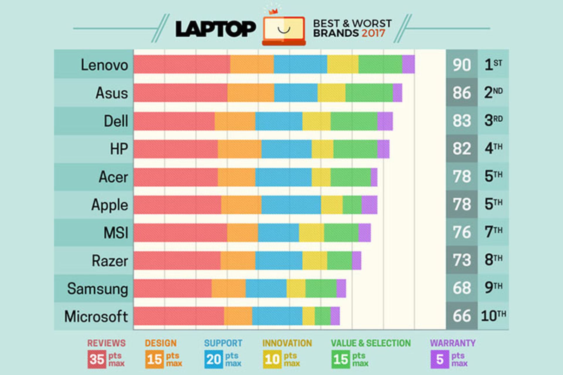 ایسر، ریزر و سامسونگ جایی در میان 5 برند برتر تولید لپتاپ ندارند اما دستگاههایی بینظیر به بازار ارائه کردهاند. بهترین قیمتها را در میان لپتاپهای ایسر میتوان پیدا میکرد. لپتاپهایی که بعضا تمام معیارهای ایدهئال و کیفیتی بالا دارند و از این لحاظ در مواردی با اپل هم میتوانند رقابت کنند. البته از نظر طراحی ایسرها حرف چندانی برای گفتن ندارند. سامسونگ هدف خود را تولیدات لاکچری با قیمت مناسب تعریف کرده است. نوت بوک 7 Spin و کرومبوک سامسونگ را میتوان نشان موفقیت کمپانی در راستای هدف خود دانست. البته وزن سنگین از معایب عمده بیشتر دستگاههای سامسونگ است. ریزر با تولید ریزر بلید، خود را به لیست 10 برند برتر دنیا رساند و میتوان گفت ریزر در بخش گیمینگ عالی عمل کرده و دستگاههایی ماندگار و سبک به دنیای گیمینگ ارائه داده است.