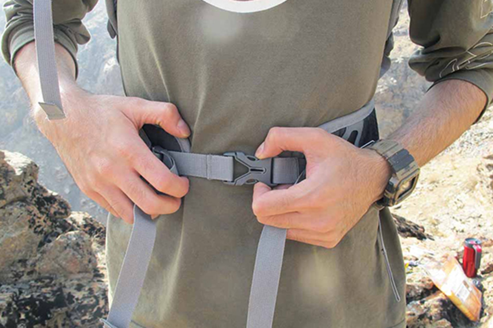 ۵. آخرین مرحله بستن بندهای سینه است. زمانیکه در شیبهای تند قدم برمیدارید، بهتر است این بند را بهصورت تنظیمشده ببندید. این بند باید طوری بسته شود که به سیستم تنفسی آسیب نرساند. همچنین، در حالتی بسته میشود که شما در شیپ حرکت میکنید.