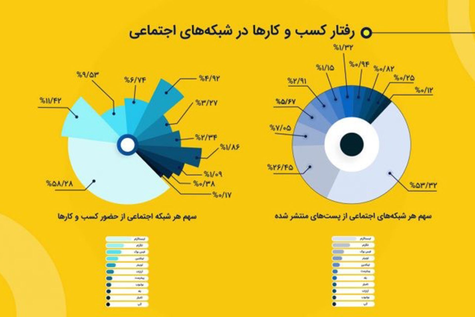 براساس گزارش نوین هاب، درحدود ۶۰ درصد کسبوکارهای فعال در شبکههای اجتماعی در اینستاگرام و ۱۱/۴۲ درصد در تلگرام فعالیت میکنند و سهم هرکدام از شبکههای اجتماعی دیگر کمتر از ۱۰ درصد است. فاصلهی درخورتوجه اینستاگرام با شبکههای اجتماعی دیگر از نکات مهم این گزارش است.