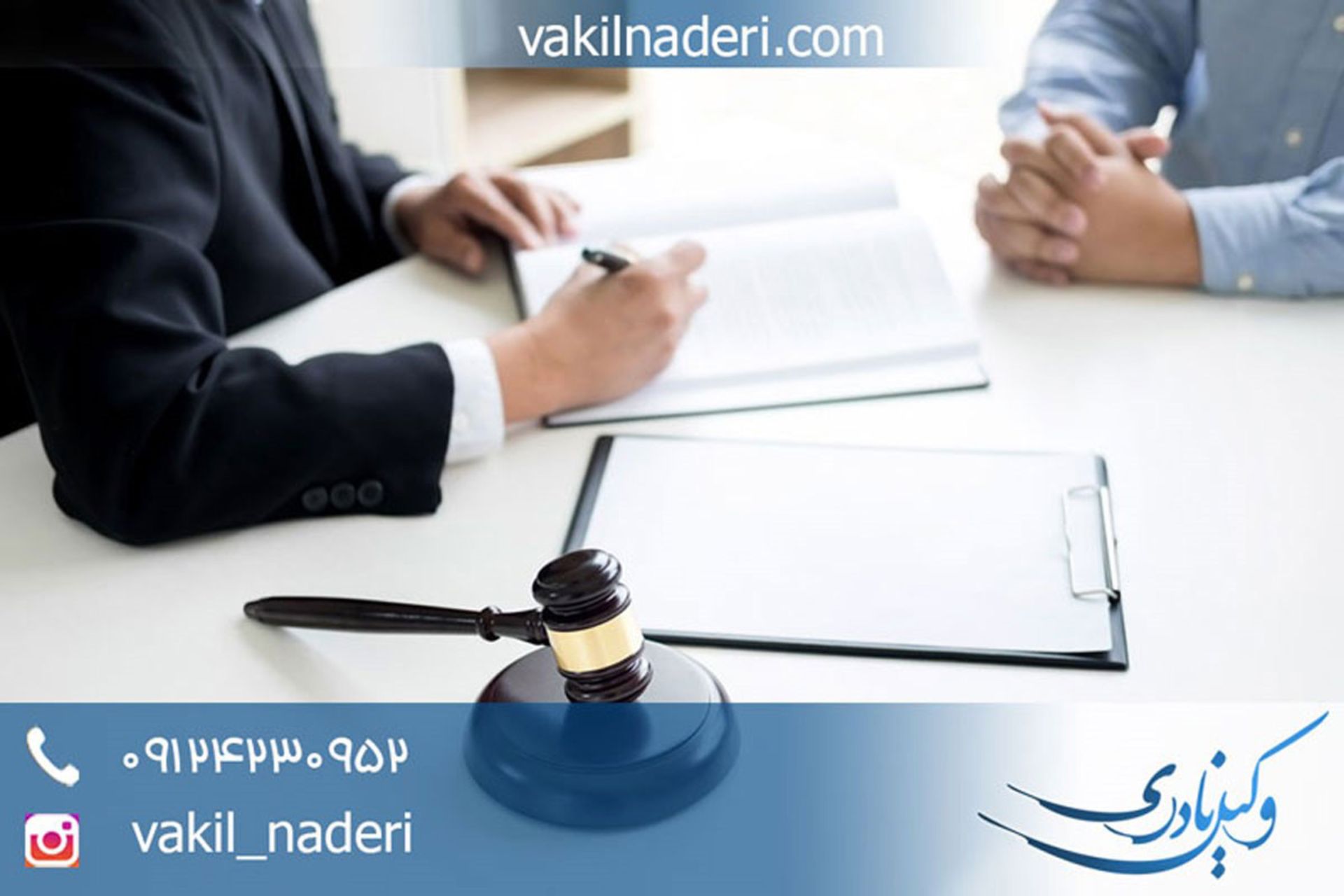 دفتر وکالت پوریا نادری وکیل پایه یک دادگستری آماده ارائه خدمات مشاوره حقوقی در حوزه های مختلف حقوقی، کیفری، خانواده، ملکی و... است. برای کسب اطلاعات بیشتر به وبسایت www.vakilnaderi.com مراجعه کنید یا با شماره تماس ۰۹۱۲۴۲۳۰۹۵۲ تماس بگیرید.