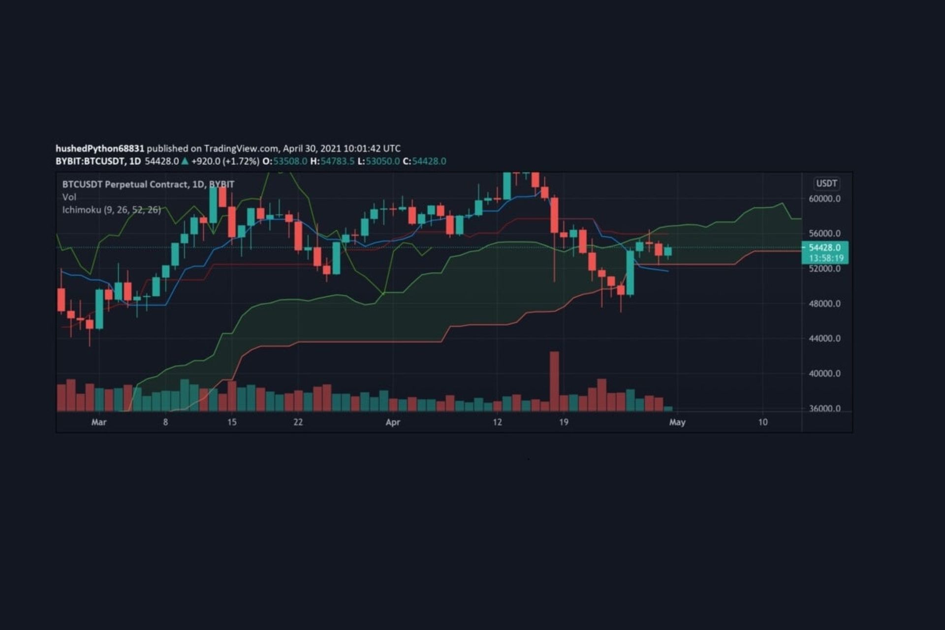 سنکو اسپن B: این خط، بیانگر میانگین بالاترین قیمت و کمترین قیمت در 52 دورهی گذشته است. فرمول محاسبهی آن نیز همانند کیجون سن و تکان سن بوده، تنها تفاوت در بازهی زمانی است که بالاترین نقطه و پایینترین نقطه در آن لحاظ میشود. از این خط نیز برای پیشبینی قیمت در 26 دورهی بعدی استفاده میشود.