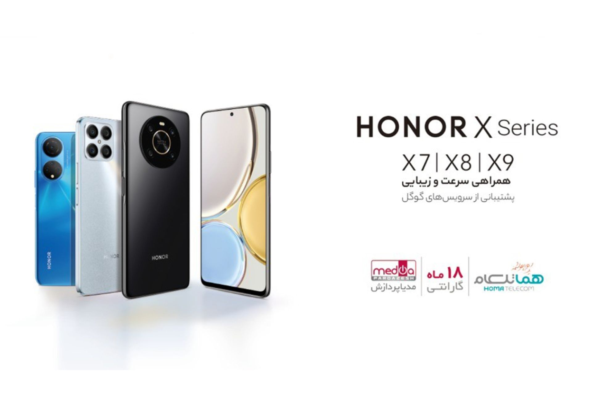 مدیا پردازش و شرکتهای توسعه ارتباطات هما (هماتلکام) با تجربهای غنی در تأمین و پشتیبانی محصولاتICT و خدمات پس از فروش که اخیراً گوشیهای هوشمند سری ایکس (X Series) مدلهای X7 و X8 را معرفی کردند، برنامه هیجانانگیزی برای رونمایی از جدیدترین عضو خانواده آنر با عنوان X9 دارند. گوشی هوشمند آنر X9 بهزودی ازطریق این دو شرکت با گارانتی 18 ماهه به بازار عرضه میگردد. شما میتوانید برای کسب اطلاعات بیشتر در مورد این مدل به وبسایتهای هر دو شرکت مراجعه کنید.