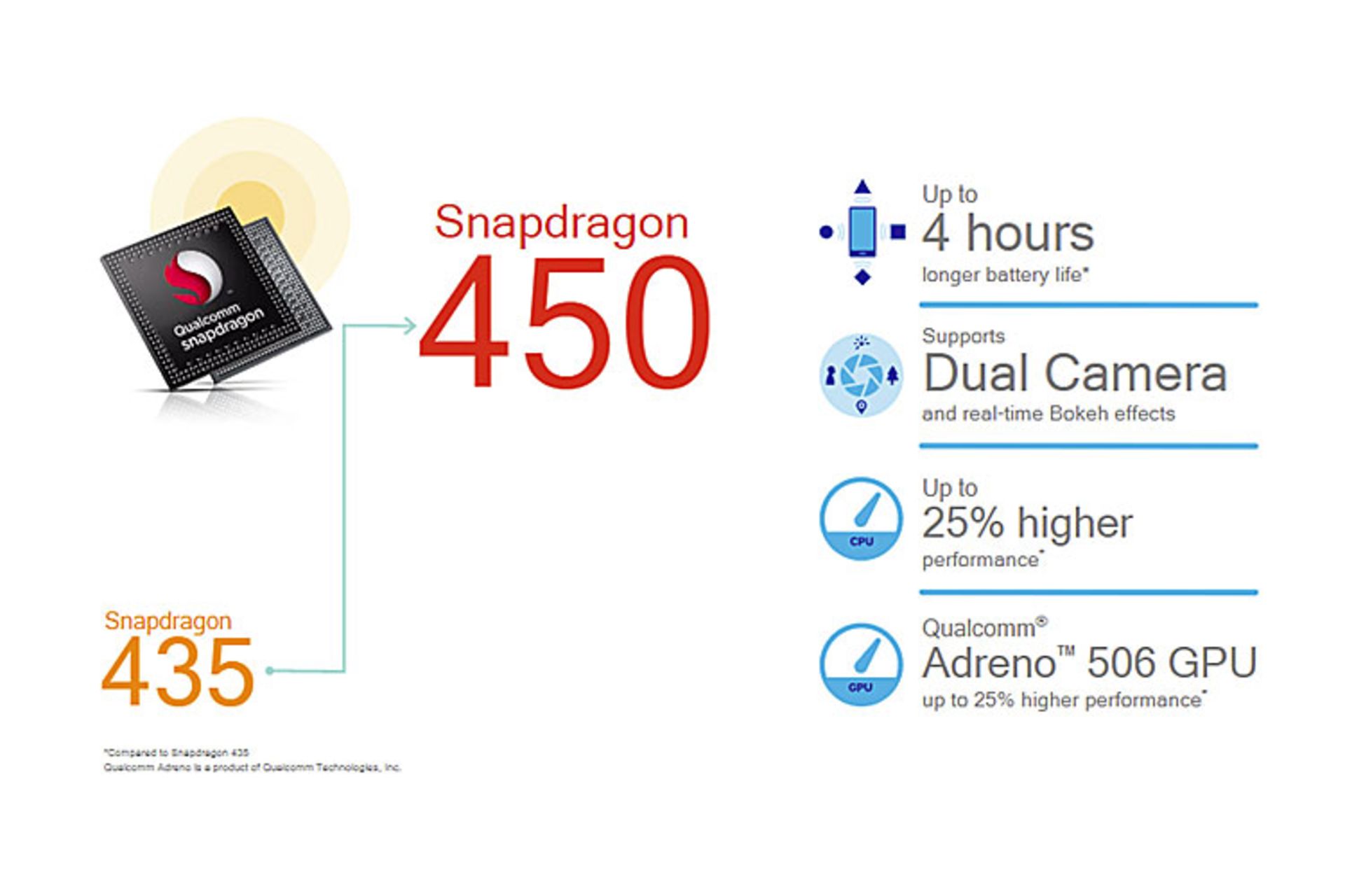 اسنپدراگون ۴۵۰ (Snapdragon 450) اولین تراشهی سری ۴۰۰ است که از معماری ۱۴ نانومتری استفاده میکند. مثل مدل پیشین یعنی اسنپدراگون ۴۳۵، این تراشه هم، هستههای Cortex A53 را کنترل میکند؛ ولی با این تفاوت که با فرکانس ۱.۸ گیگاهرتز کار میکند.