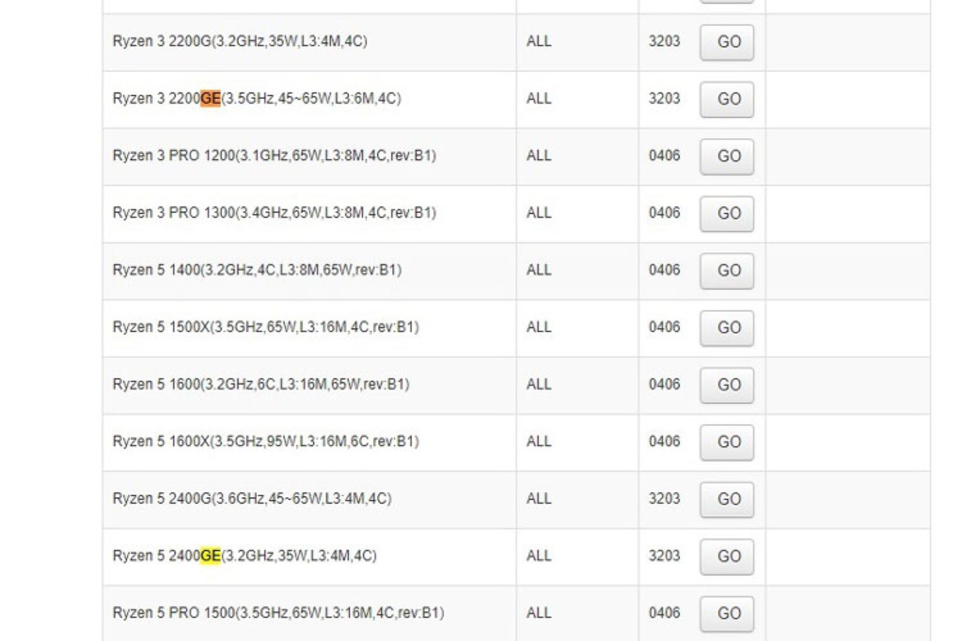 در خصوص مشخصات ای‌ام‌دی رایزن ۵ 2400GE باید گفت این پردازنده چهار هسته‌ای و هشت تردی است. فرکانس پایه‌ی این APUا۳.۲ گیگاهرتز است و در مورد فرکانس توربوی آن اطلاعی در دست نیست. این تراشه، گرافیک وگا ۱۱ را با ۷۰۴ پردازنده‌ی استریم در خود جای داده است. فرکانس پردازش گرافیک فعلا نامشخص است. در سوی دیگر، رایزن ۳ 2200GE پردازنده‌ای چهار هسته‌ای و چهار تردی و همانند مدل دیگر، فرکانس پایه‌ی آن ۳.۲ گیگاهرتز است. فرکانس توربو و گرافیک این مدل هنوز نامعلوم هستند. احتمالا قیمت این دو مدل نسبت به مدل‌های ۶۵ واتی کمتر خواهد بود؛ چرا که قرار است به عنوان تراشه‌های مقرون‌به‌صرفه توسط شرکت‌هایی نظیر HTPC و eSports مورد استفاده قرار گیرند.